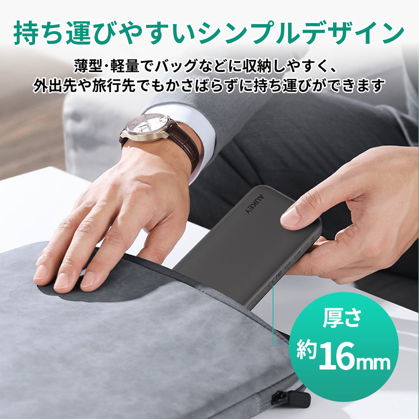 厚み約1.6cmのスリム設計なので、スマホなどの機器を充電しながら重ねて持ちやすく、携帯にとても便利です。
