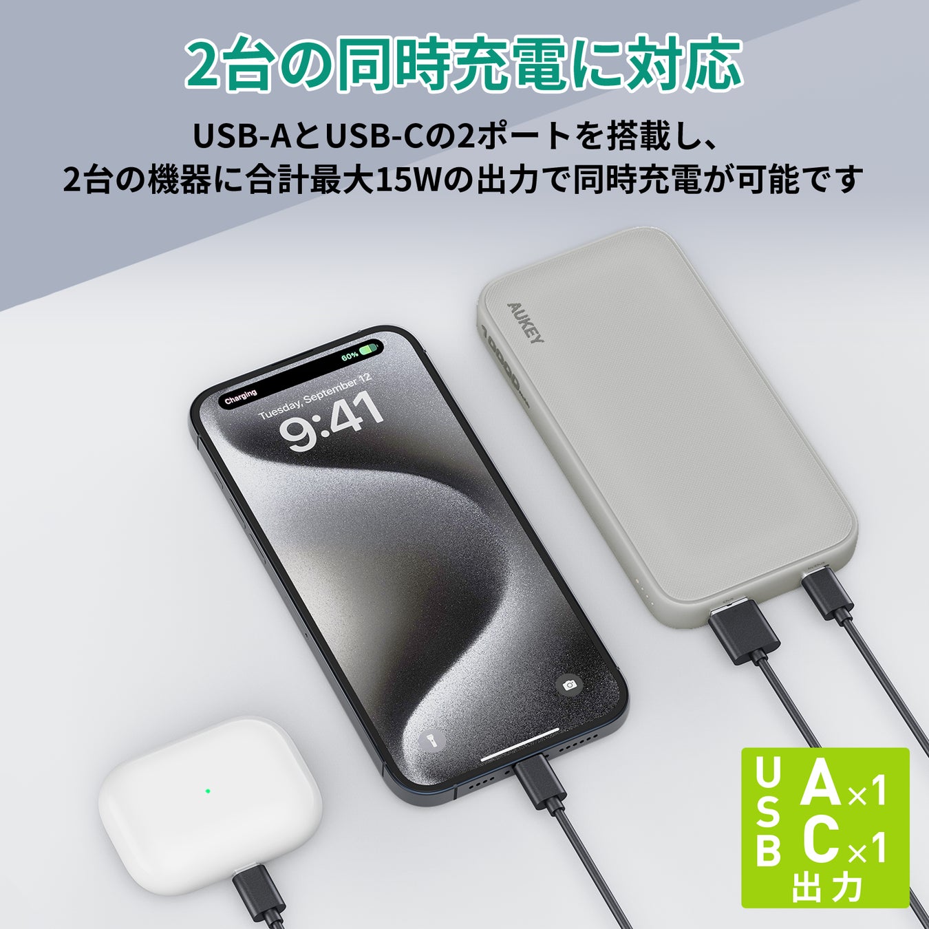 USB-AとUSB-Cの2つのポートを搭載し、単ポート使用時はそれぞれ最大15Wの出力をサポート。