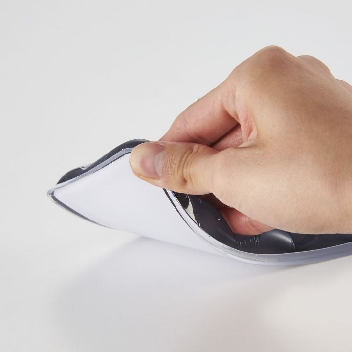 独自の凹凸加工により、手首とリストレストの間に適度な隙間が生まれ、さらっとした使い心地と通気性の良さを実現しました。TPU素材の透明感あふれるツートンカラーは、デスク周りのアクセントにもぴったりです。底面はしっかり吸着する素材で、使用中のズレや移動を防ぎます。また、手洗いが可能なためいつでも清潔にお使いいただけます。