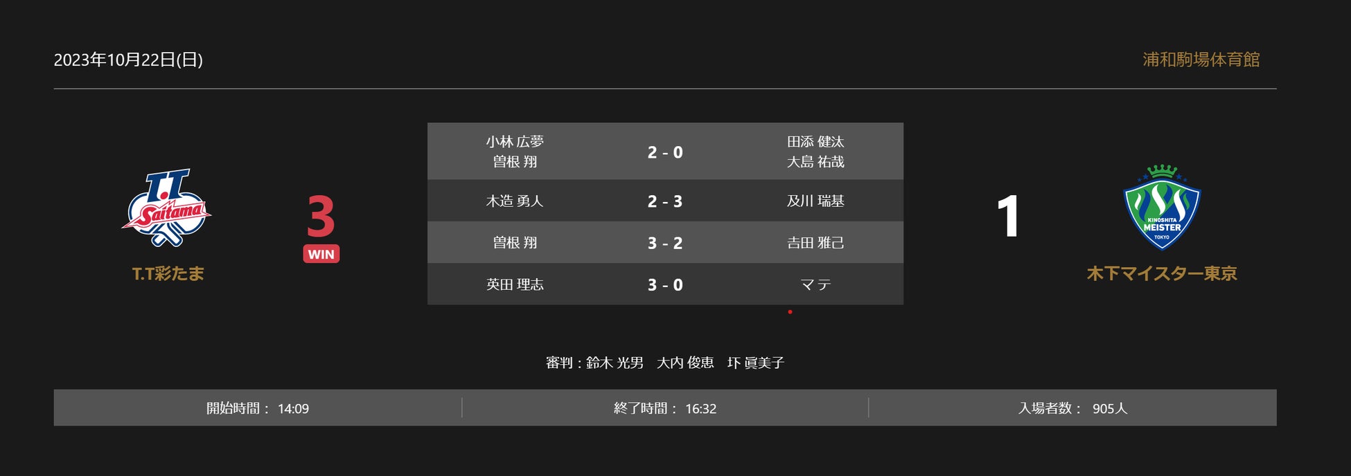 ノジマTリーグ 2023-2024シーズン 公式戦 10月22日開催 T.T彩たま vs 木下マイスター東京 試合結果