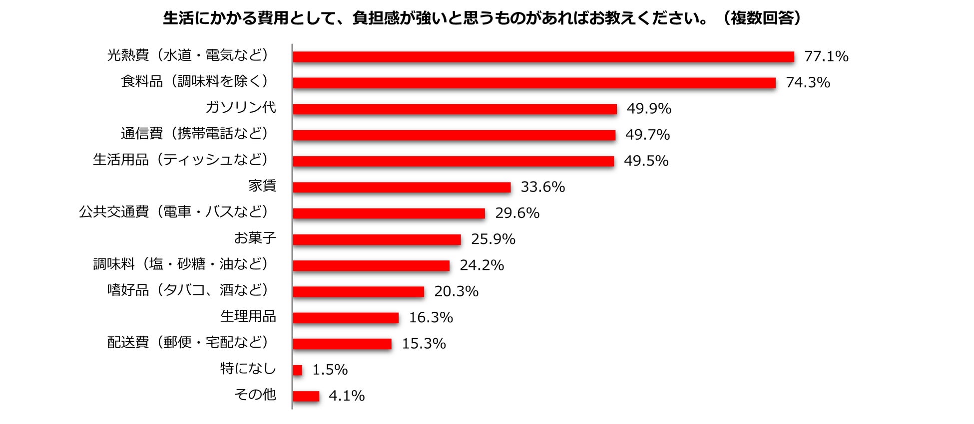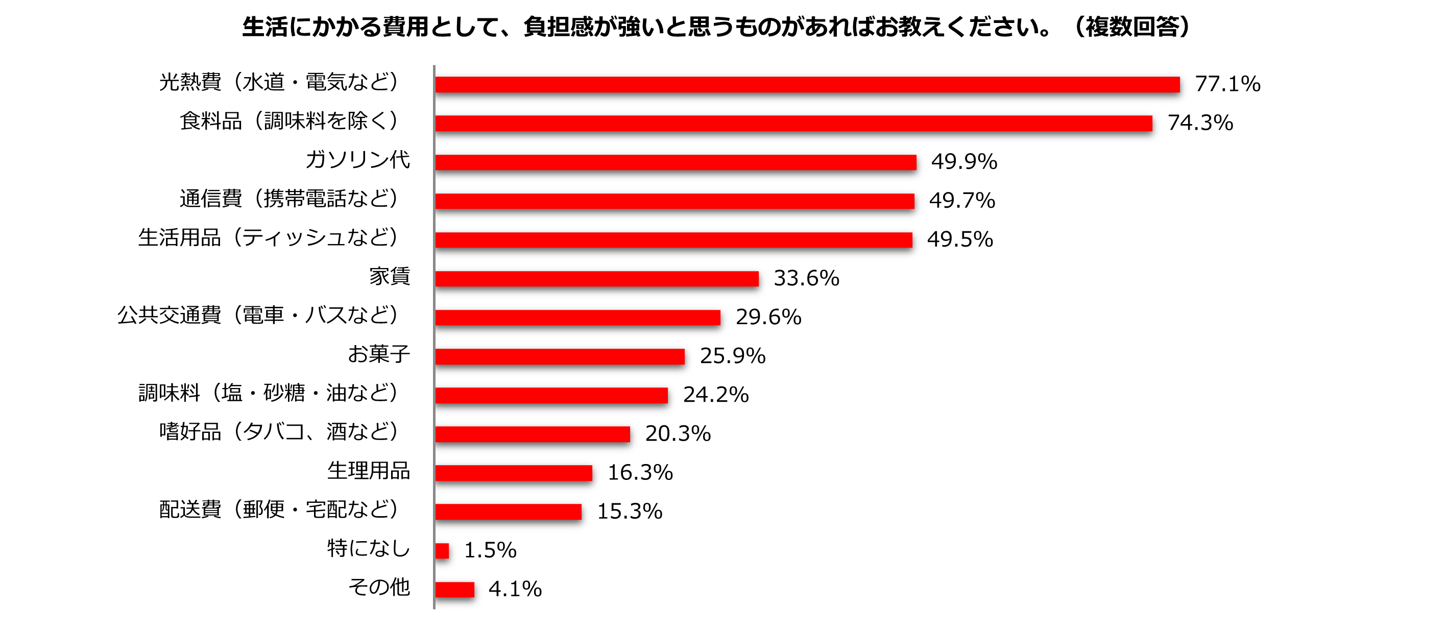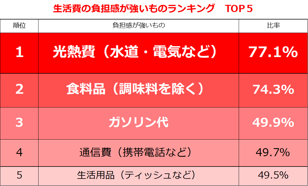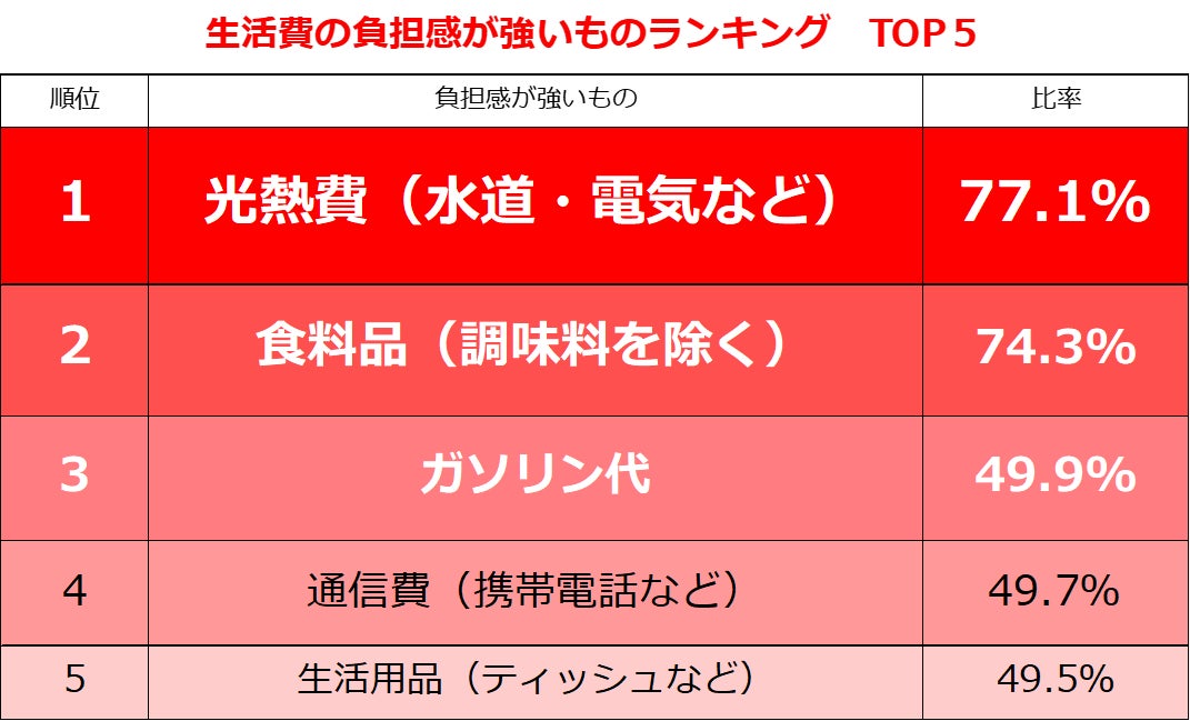 生活で負担感が強いものランキング:1位「光熱費」、2位「食料品」、3位「ガソリン」 ~しゅふJOB総研調査~