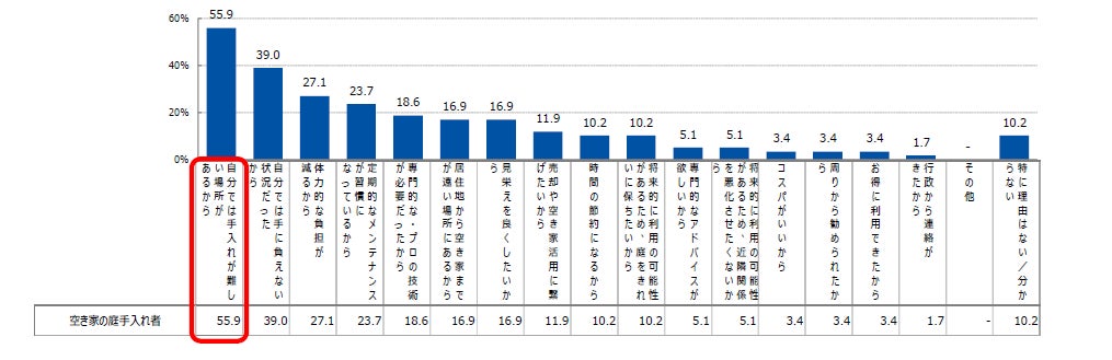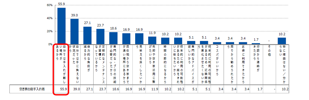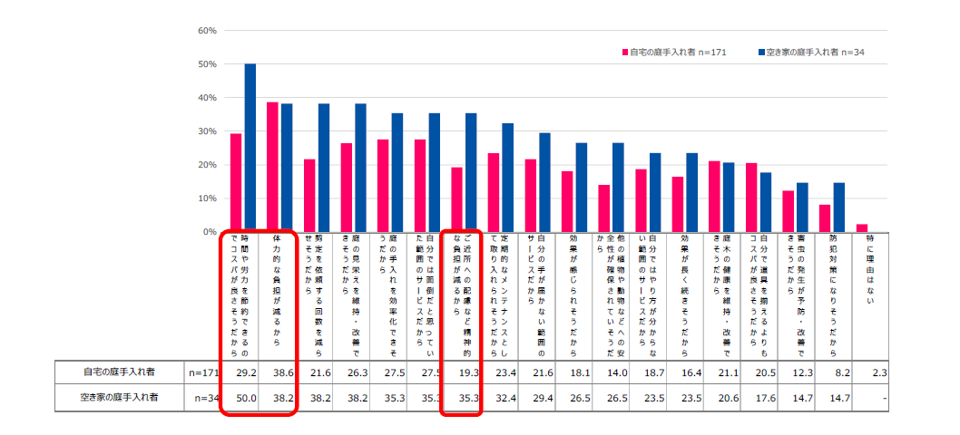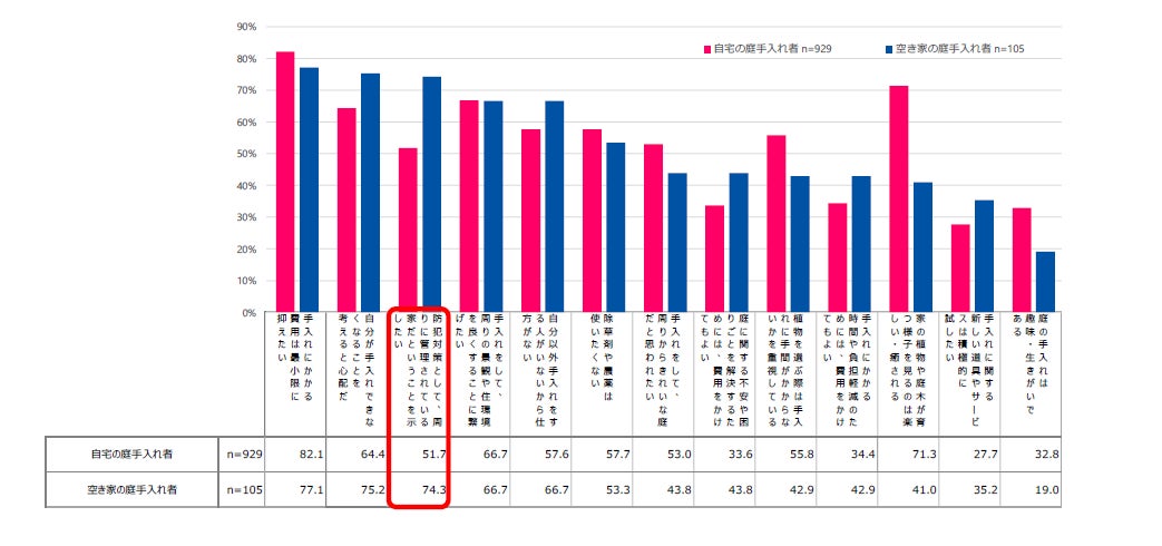 ・自宅の庭の手入れ者の約51.7%、空き家の庭の手入れ者の約74.3%が「防犯対策として管理されている家だと示したい」と回答。防犯に対して庭の管理が一定の効果があるとの認識を示している。