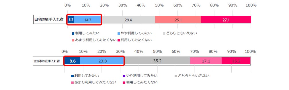 庭木の枝の成長を安全に遅らせることができるトータルグリーンの「枝伸び抑制サービス」の利用意向についてもお聞きしました。空き家の庭で約32.4%が「利用してみたい」または「やや利用してみたい」と回答しました。自宅の庭では約18.4%となり、空き家の管理ニーズがより高いことが見られます(表13)。利用したい理由としては自宅の庭・空き家の庭共通で「体力的負担が減る」と感じる人が多く、空き家の庭では「時間・労力の節約でコスパが良さそう」が約50.0%、「ご近所への配慮など精神的負担が減る」が約35.3%と高くなりました。自宅より空き家の庭で負担軽減のニーズが高いことが、改めて明らかになりました(表14)。