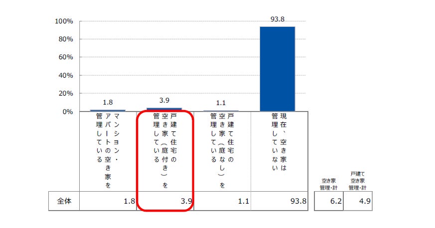 ・戸建ての庭付き空き家を管理している人の割合は全体で約3.9%。
