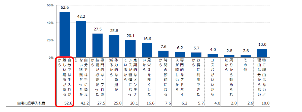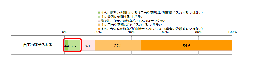 自宅の庭の手入れについて、業者依頼の有無については、「すべて自分や家族で手入れしている」が約54.6%と半数を超えました。一方、主に業者に依頼する人は約9.2%と少数でした。自宅の庭はなるべく自分たちで管理しようとする意識が反映されています(表3)。