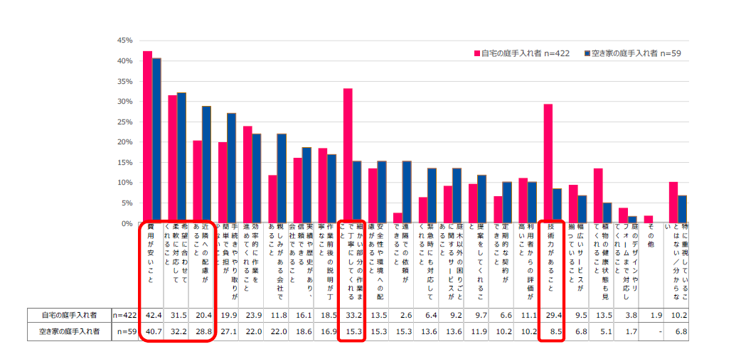 業者に依頼する理由は、自宅・空き家共通で、時間や体力よりも「自分では手入れが難しい場所・作業の依頼」が50%以上と最も多くなりました(表7)(表8)。業者選びの重視点は自宅の庭・空き家の庭共通で「費用が安いこと」が多くを占めました。自宅の庭では、技術や細かい部分について重視されている面がある一方、空き家の庭では、「希望に合わせて柔軟に対応してくれること」「近隣への配慮があること」が自宅の庭より重視する人が多くなりました(表9)。