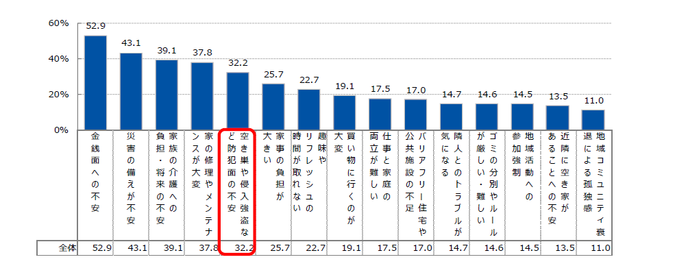 ・「防犯に不安」と回答したのは約32.2%。 特に、住居形態が「戸建て/戸建て(庭付き)」が、他の