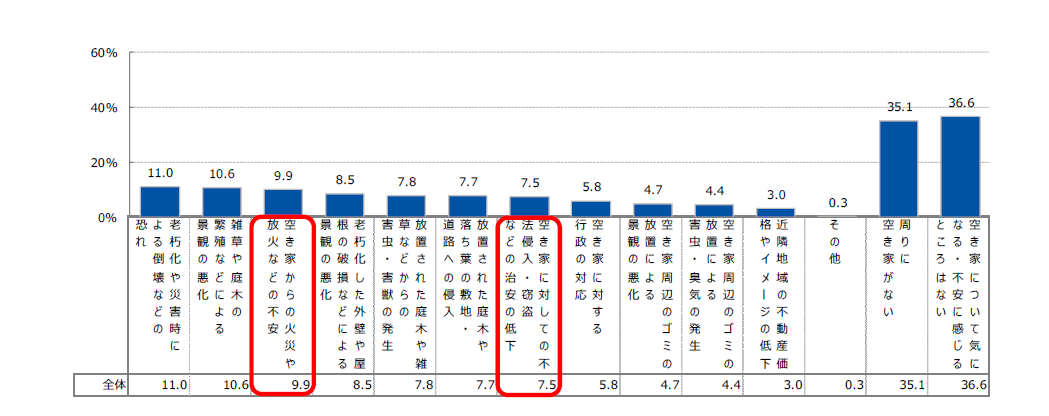 暮らしの中での防犯に関する意識について、「防犯に不安」と回答したのは約32.2%の人が感じておられました(表10)。また、周囲の空き家に関する防犯への不安面は、「空き家からの火災・放火などの不安」が約9.9%、「不法侵入・窃盗など治安悪化の不安」が約7.5%となり、管理されていない空き家に対して一定数の近隣住民が不安を感じていることが分かりました(表11)。