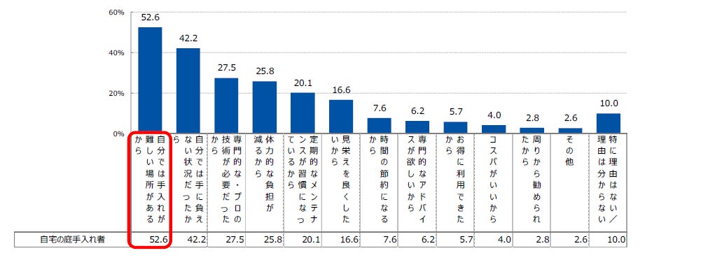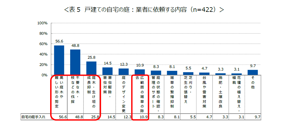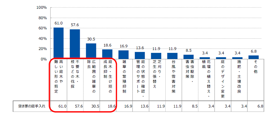 業者に依頼する内容としては、自宅・空き家ともに「高い庭木・難しい形の剪定」が最も多く、次いで「不要な木・枝の伐採」が続きました。自宅の庭では、「庭木・生け垣の成長抑制」も約25.8%となり、「広範囲の雑草除去」は自宅の庭では約10.9%、空き家の庭では約30.5%となり、空き家の雑草処理の負担が大きいことがうかがえます(表5・表6)。