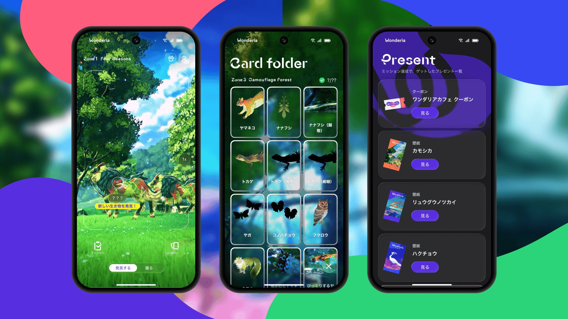 株式会社ディー・エヌ・エーが企画・運営する「ワンダリア横浜」は、デジタル技術による映像空間で非日常的な没入体験を提供し、生き物や自然との遭遇を楽しむことができる施設です。来館者用のスマートフォンアプリ「ワンダリアアプリ」により、映し出された生き物などにスマートフォンをかざすと詳細な情報が得られ、映像に隠れた生き物を発見する探索体験もできるなど、学びにつながる気づきを得ることができます。