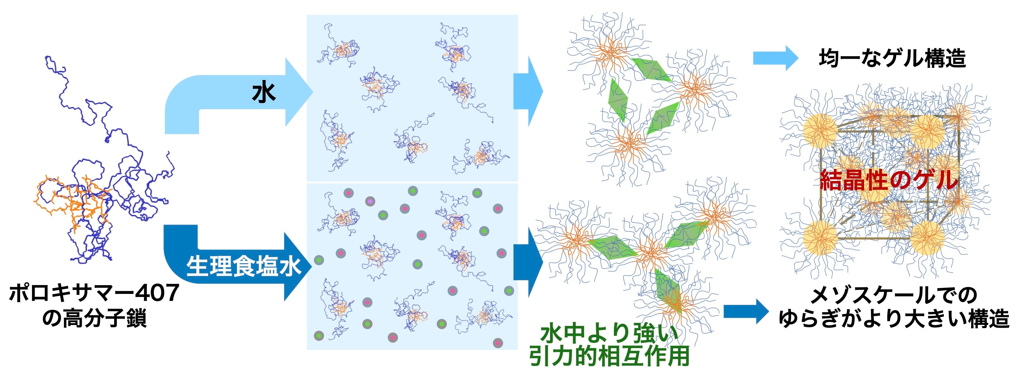 また、高分子ミセル、例えばP407は、結晶相であるゲルを形成する過程において、Alder(アルダー)転移とよばれる乱雑さの相違のみに起因し、非晶質(ゾル)から結晶相(ゲル)への変化を示しますが、関連した基本原理として、この結晶化過程では系を構成する粒子がより整然と整列しつつも粒子周囲の空間が増すことが知られています。本研究において、高分子ミセルのゲル化の過程で、ミセル間が互いに距離を離す挙動が突き止められました。例えば、図2の右図で、生理食塩水中での22℃(青線)から24℃(緑線)の変化において、安定化する位置や緑矢印部分の極小点位置が24℃で遠方にあります。この挙動から理解できることとして、生理食塩水中での脱ゲル化温度の低下があります(図1b)。より強い引力相互作用をミセル間が持つ場合は、ゲル化過程において、結晶化が均一でなくなり密集した凝集状態を残存させ、メゾスケールで観察される構造のゆらぎが生じます。この構造のゆらぎが、ゲルの崩壊を進行させることで、水中より生理食塩水中で、脱ゲル化が低温で生じるとするメカニズムが提案されました(図3)。