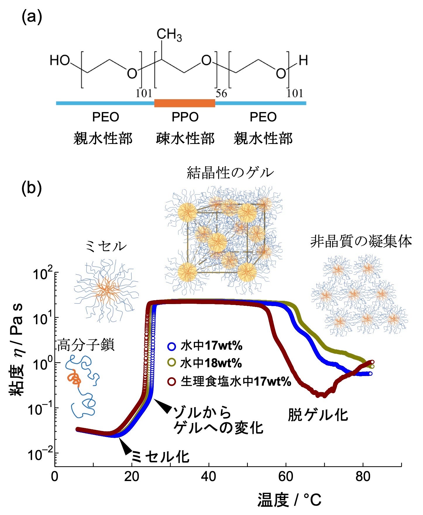高分子ミセルは、高分子の鎖同士が自己集合し、例えば水溶液中では疎水性の部分が内側(コア:図1のオレンジ部)、親水性部が外側(シェル:図1の水色部)に配置された構造を持つ集合体です。図1は、両端が親水性部、中央に疎水性部を持つ「ポロキサマー407(P407)」とよばれる高分子鎖について、水溶液中でのミセル化、ゲル化、脱ゲル化の様子を、粘度変化とともに示しています。食品のゼリーなどとは逆で、温度の上昇によりゲル化し、ゲルは体温付近で最も安定になります。
