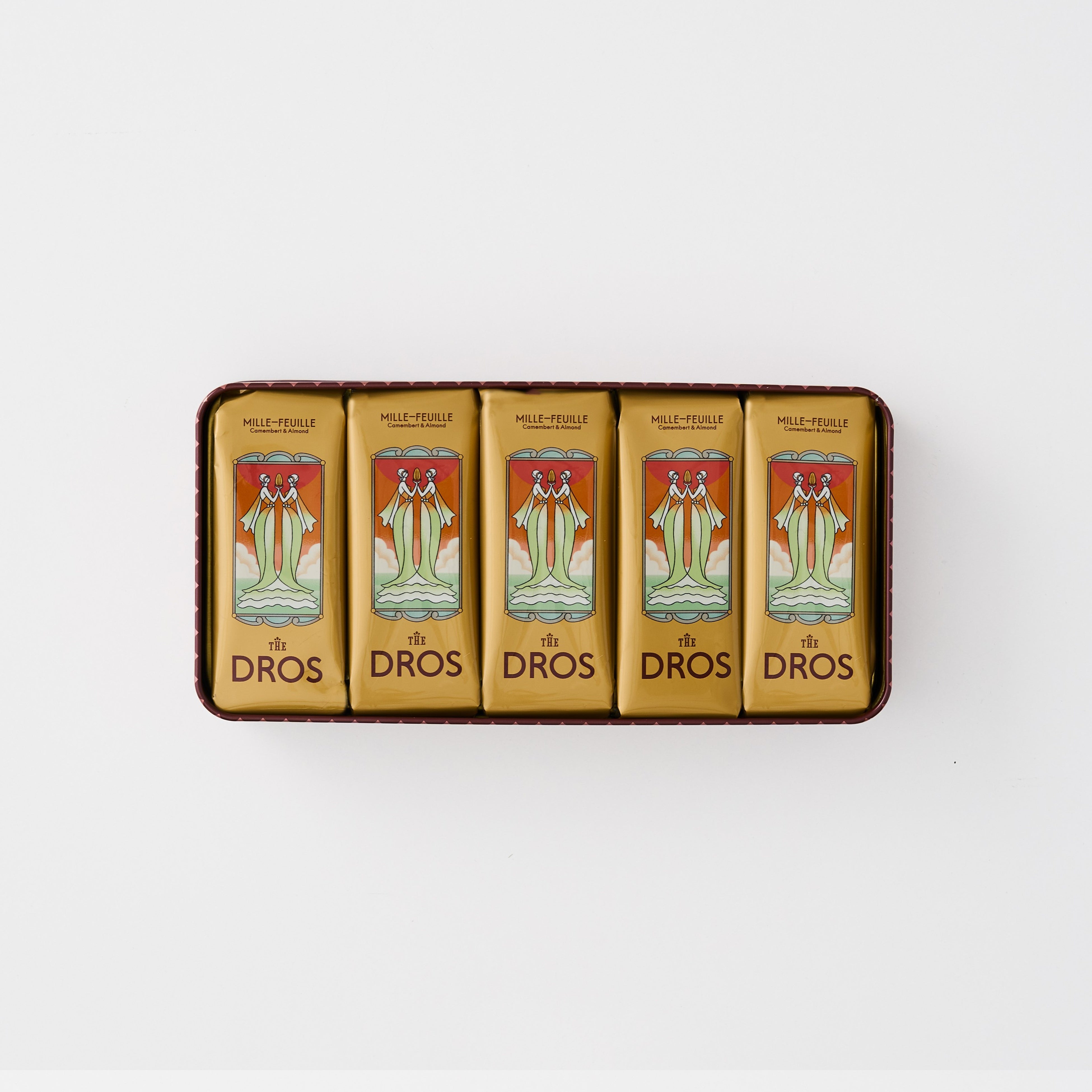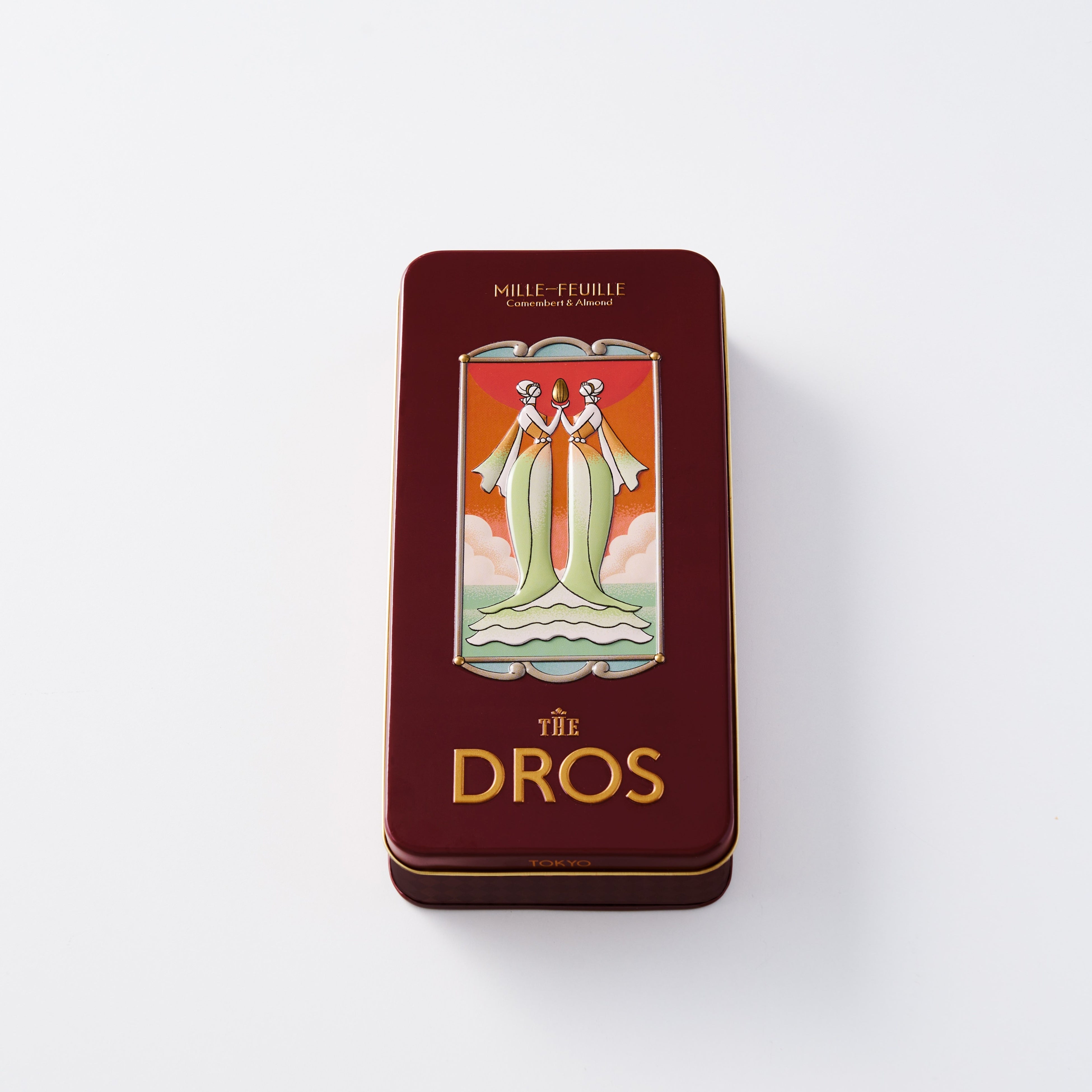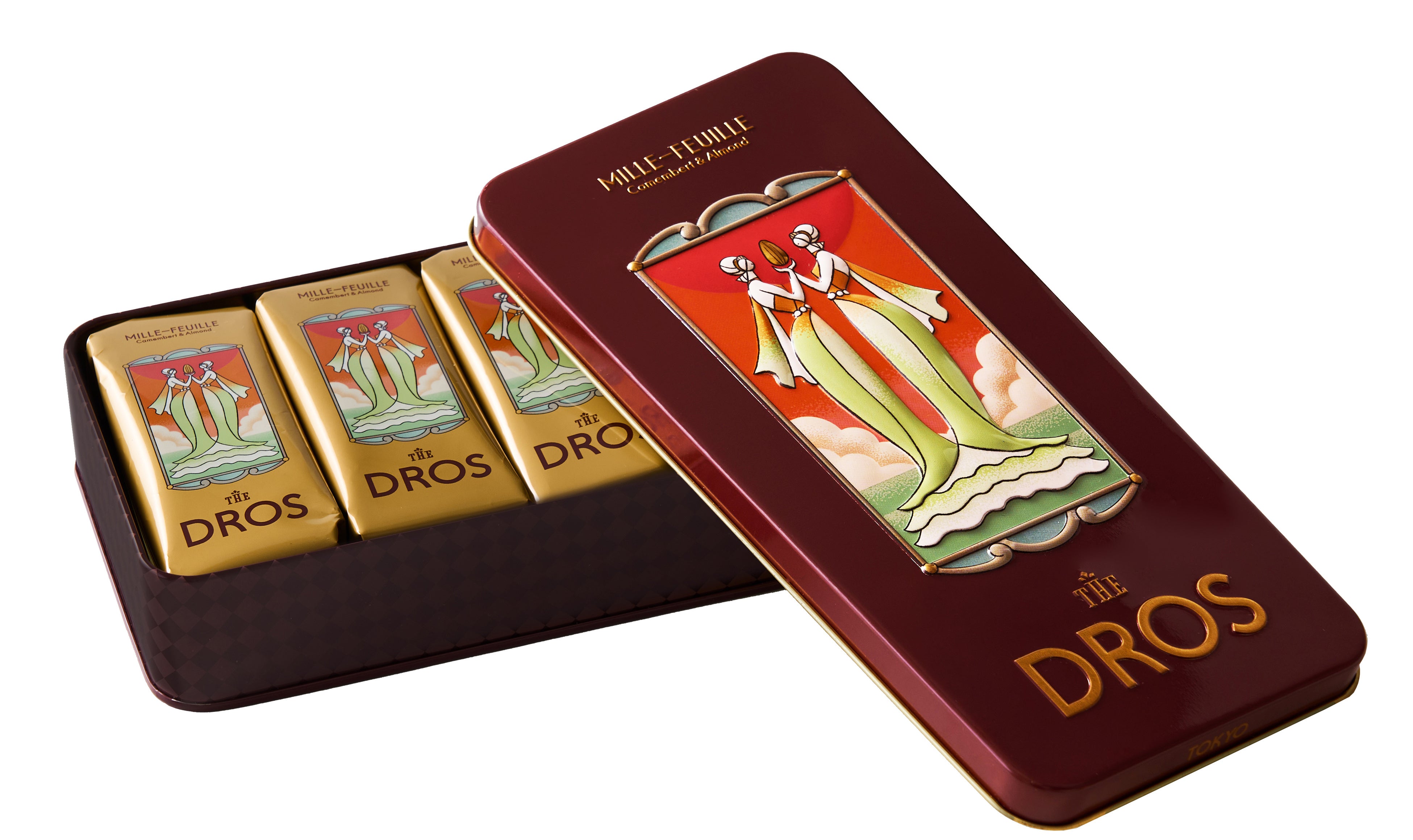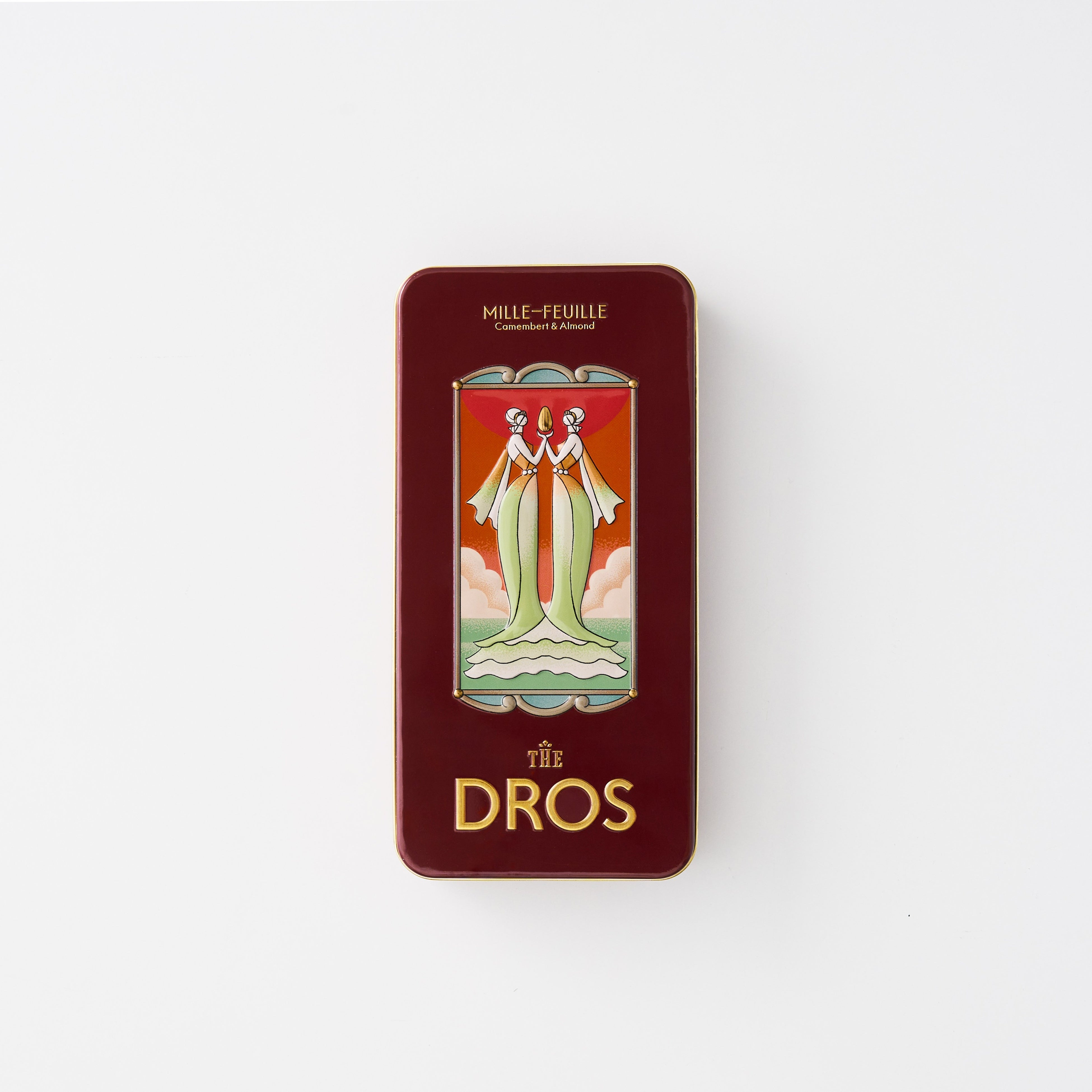 【DROS】は、パッケージも美しいおしゃれなギフトとしても注目されています。優美に向かいあう女神を幾重にも重なる2枚のパイ生地に見立てデザインしました。軽やかで上品なお菓子の味わいを、手にとる瞬間から楽しめる【DROS】ならではの魅力的な商品です。
