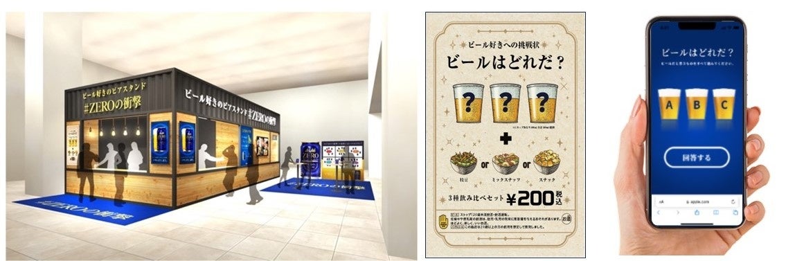 発売したばかりの『アサヒ ゼロ』を体感できる期間限定のバーです。10月24日から10月29日まで、阪急大阪梅田駅ビックマン前で展開します。『アサヒ ゼロ』『アサヒスーパードライ』『アサヒドライゼロ』の3種の商品名が隠された状態から“本物のビール”を当てる3種飲み比べセットが楽しめます。