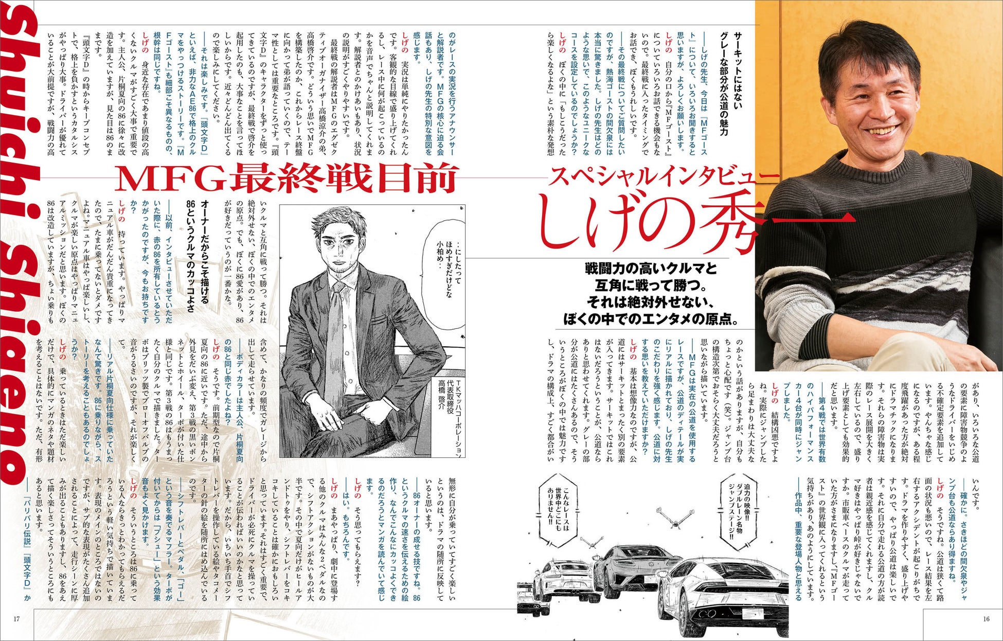 巻頭からはじまるMFゴースト・頭文字D・バリバリ伝説のカラーイラストの後には、しげの秀一先生のスペシャルインタビューを収録。MFゴースト最終戦目前でのインタビューは必読の内容となっている。