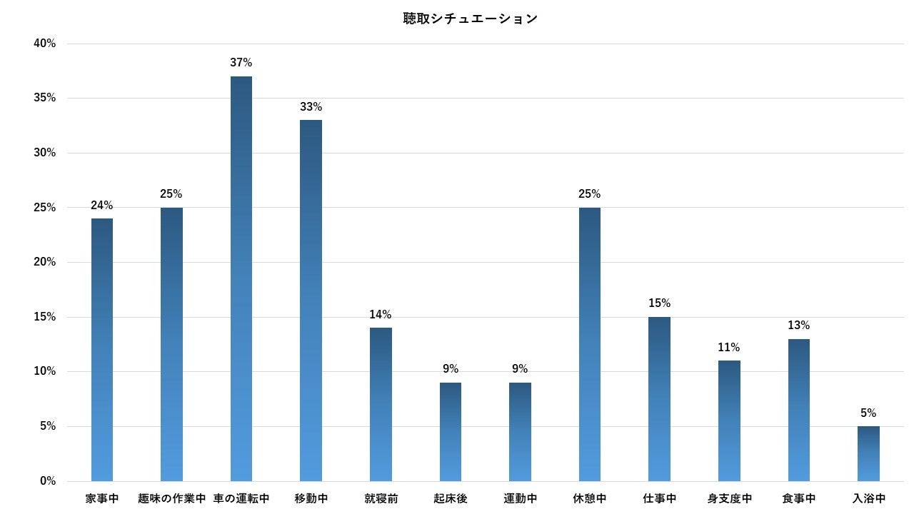 「車の運転中」が37%と最も多く、続く「移動中」が33%という結果に。その他、「家事中」や「趣味の作業中」、「休憩中」など様々なシチュエーションで聴取されていることも明らかになりました。