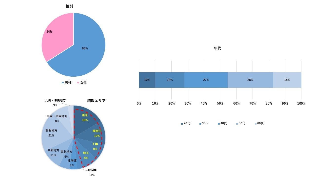 男女比は男性が6割強と比較して多く、年代は40代と50代が合わせて5割強とボリュームゾーンに。エリアは最も割合の多い東京を含めた1都3県で4割強、加えて関西地方も合計21%と都市部がボリュームゾーンに。