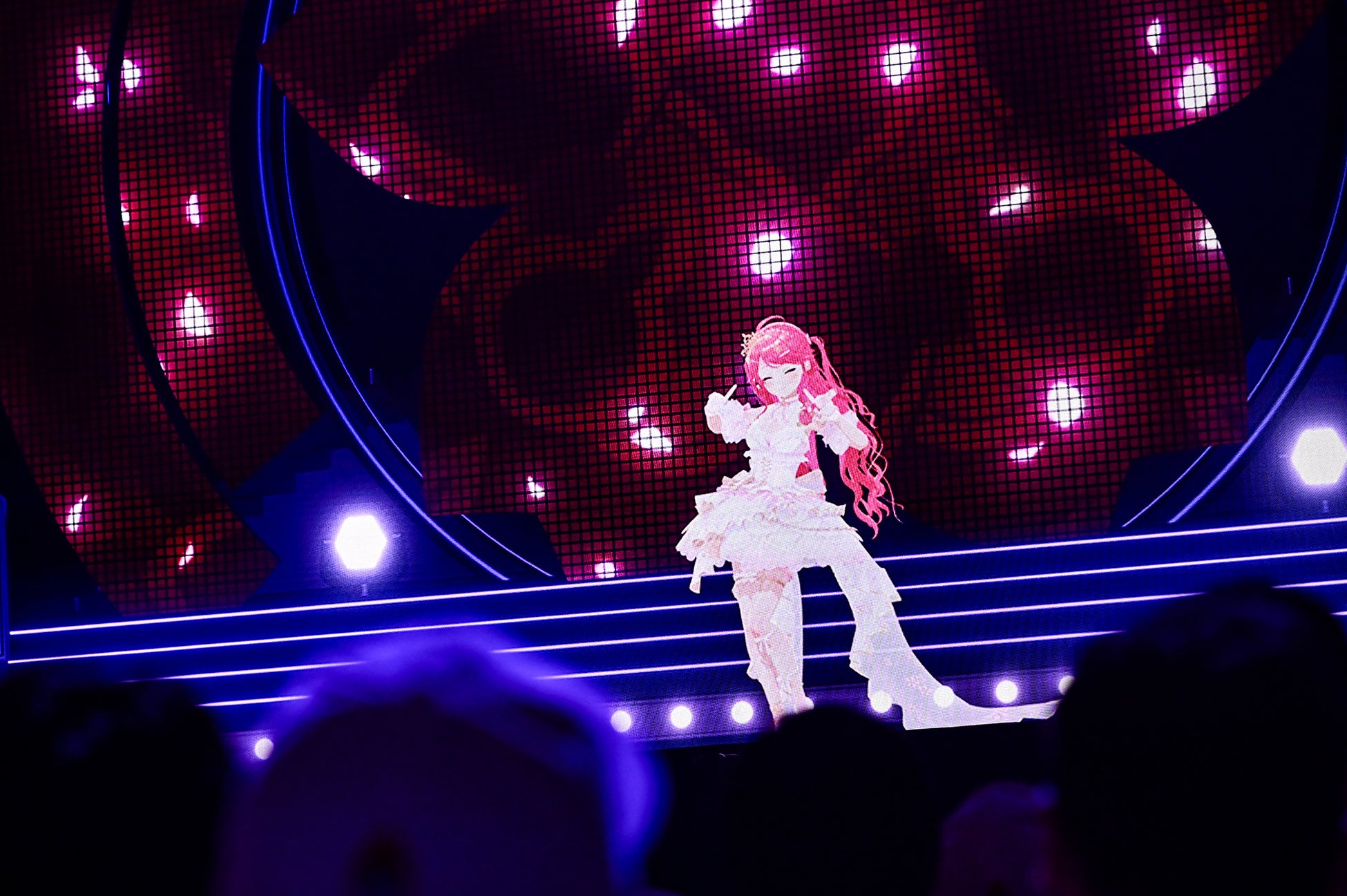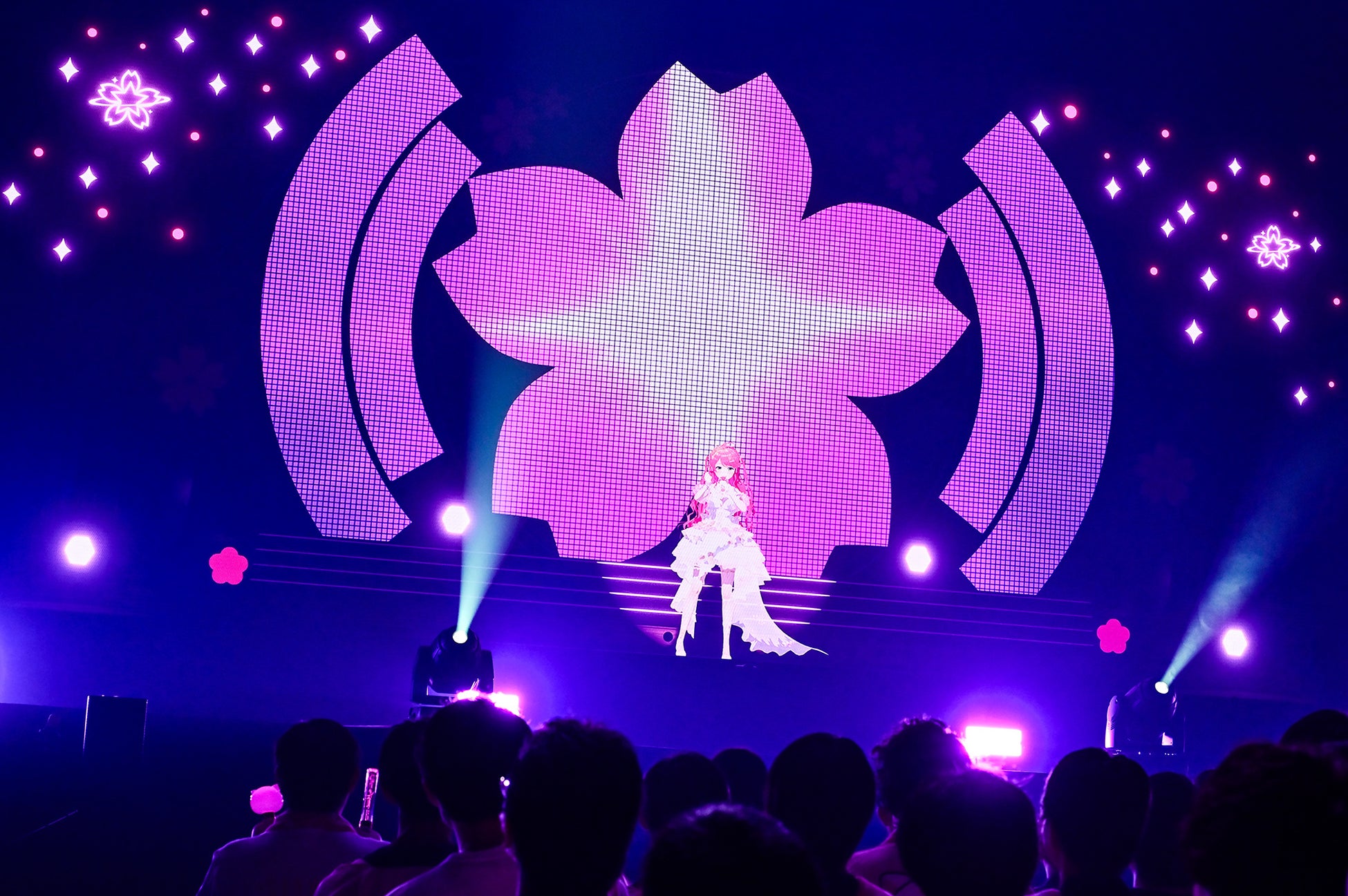 星街すいせいの衣装の腰布に合わせるように、さくらみこの衣装にも桜柄のカーテンのようなリボンヴェールが伸び、始まったのは「Stellar Stellar」。星街すいせいの代表曲で、『hololive shuffle medley』で見せたデュエットパフォーマンスが、目の前で再現された形だ。ステージ後方では桜型のスクリーンに流星が降り注ぎ、2人の歌姫の歌声と世界観が美しく融合していた。