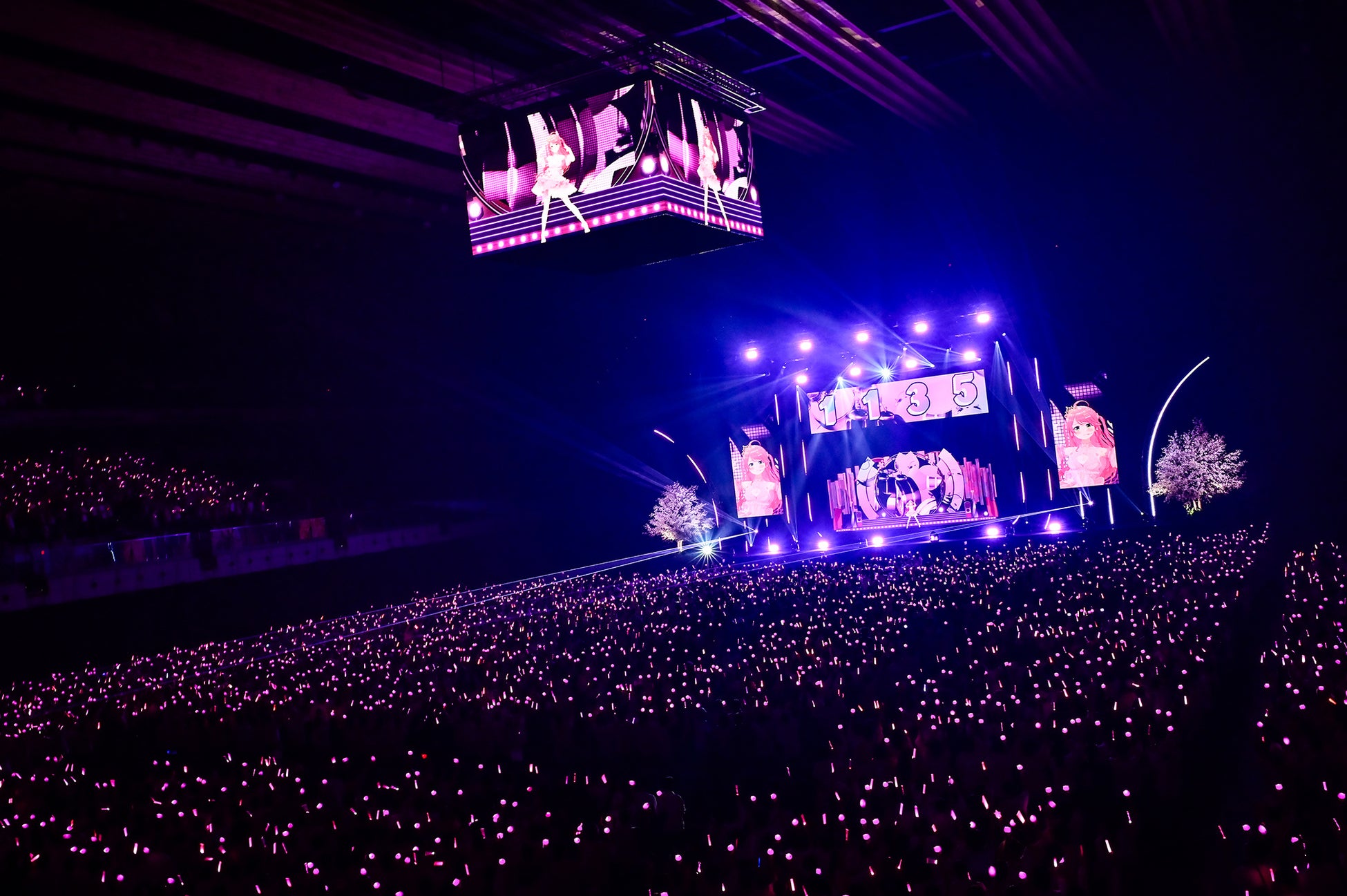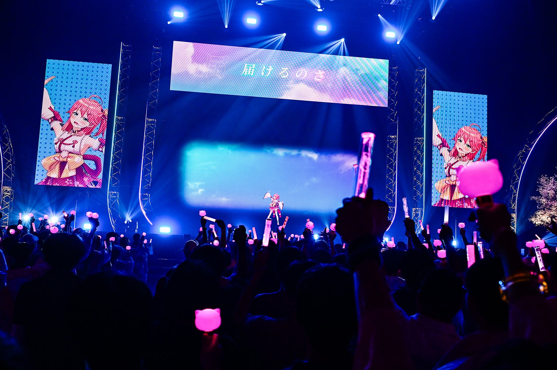 オープニングムービーは、デビュー時の動画を思わせる粋な演出。35からスタートしたカウントダウンに、ピンク色に染まった35Pライトが花を添える。割れんばかりの歓声の中、エモーショナルなイントロでスタートしたのは本人も作詞に参加した「アワーツリー」。「にゃっはろー!みこのソロライブ、みんな、いくぞー!」という力強い挨拶とともに、さくらみこが現れた。華奢な体で振り付けを踊るたび、ピンクの髪が華麗に舞う。その様子は堂々かつしなやかで、可憐さと優美さを併せ持っていた。