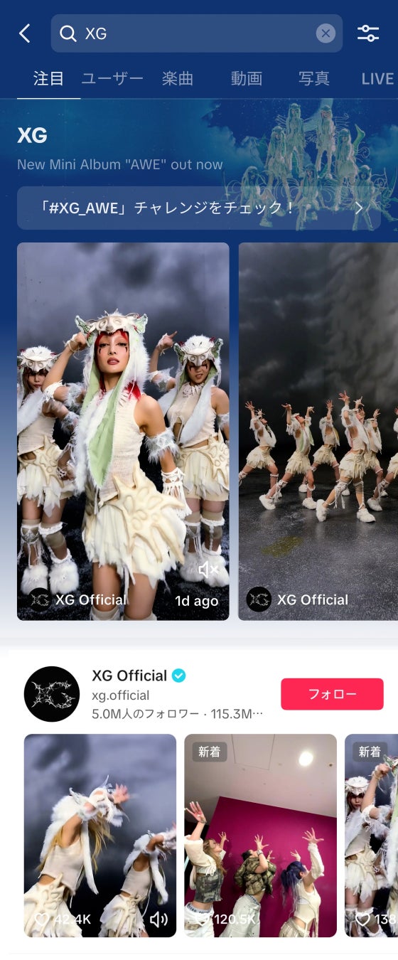 また、チャレンジの実施と合わせて、検索結果がアーティスト仕様にデザインされる「検索特設ページ(Search Hub)」を公開しました。TikTokアプリ内で「XG」を検索すると、この検索特設ページが表示されます。本検索特設ページでは、ハッシュタグ「#XG_AWE」を使用したさまざまな動画投稿を閲覧することができます。