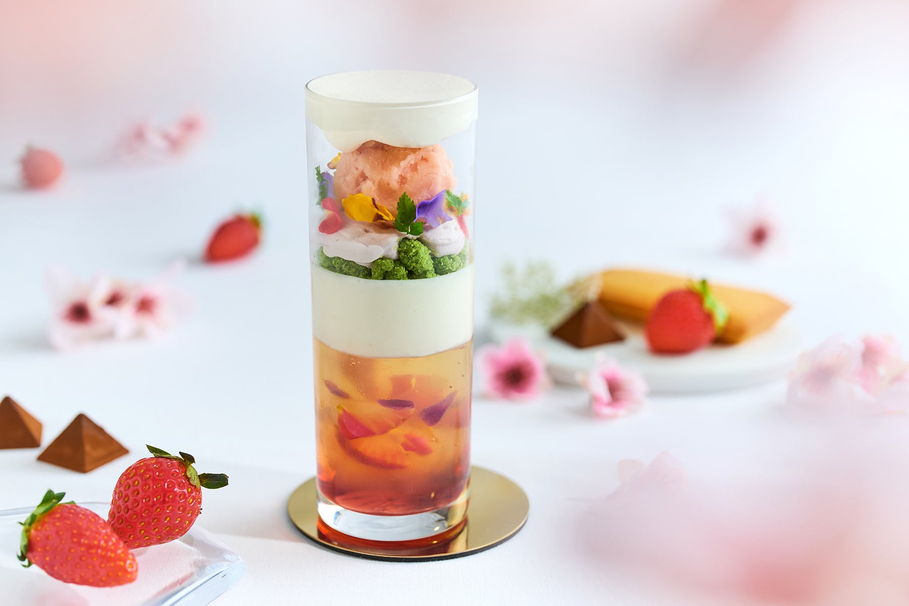 花を瓶に入れオイルで漬ける「ハーバリウム」をイメージした、春らしい見た目の「おたるフラワーワインパフェ」が楽しめます。ジュレには、小樽の小規模ワイナリー「OSA WINERY(オサワイナリー)」で醸造している白ワインを使用。濃厚なクリームの味わいと春の酸味のあるいちご、さっぱりとしたワインジュレを合わせ、春の華やかさを表現しています。