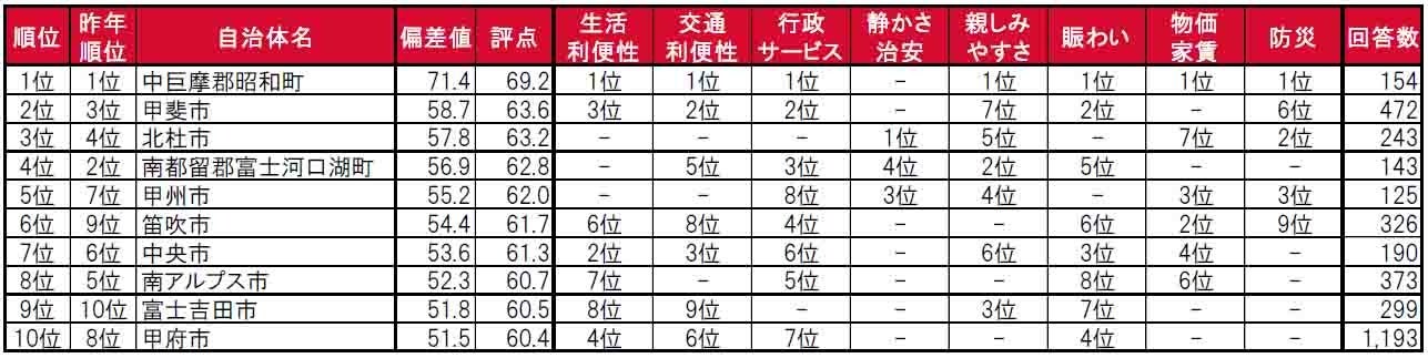 「いい部屋ネット 街の住みここちランキング2024<山梨県版>」 主なポイント