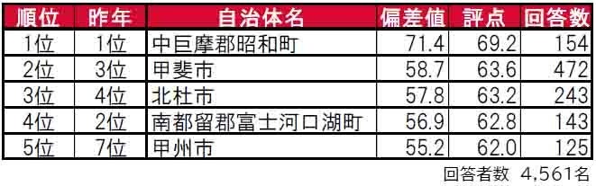 住みここち1位は5年連続で中巨摩郡昭和町。2位甲斐市、3位北杜市。