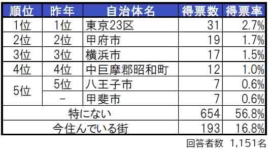 住みたい街のトップ3は3年連続で、1位東京23区、2位甲府市、3位横浜市。