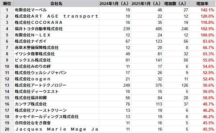 ・2024年1月時点と2025年1月時点の従業員数を比較
