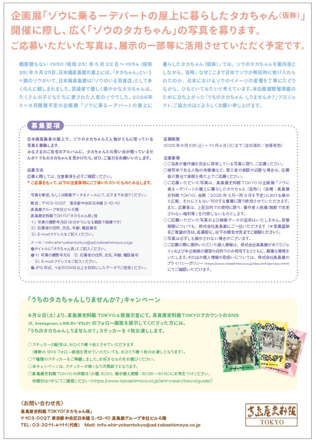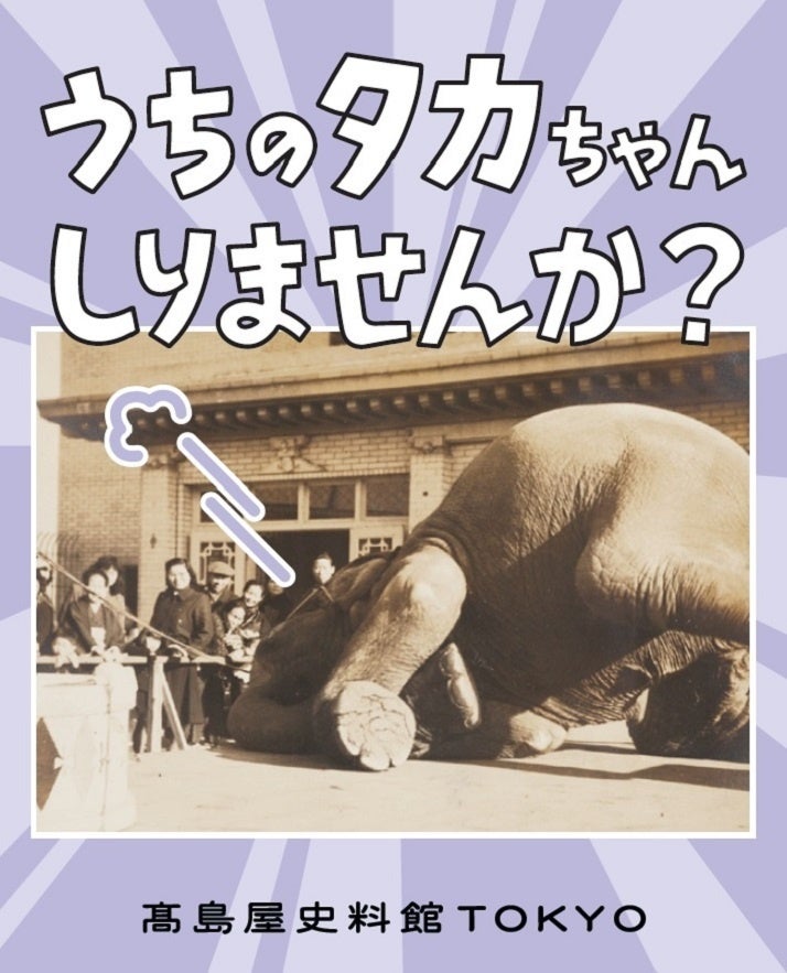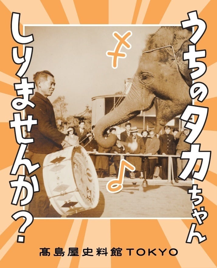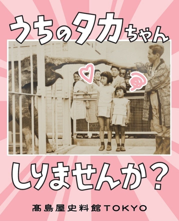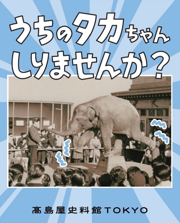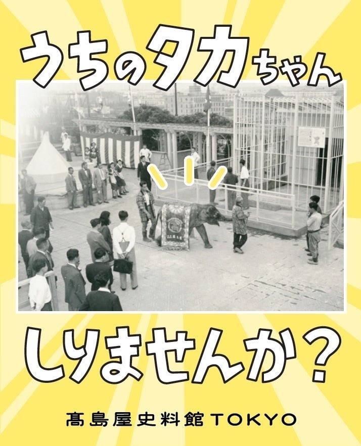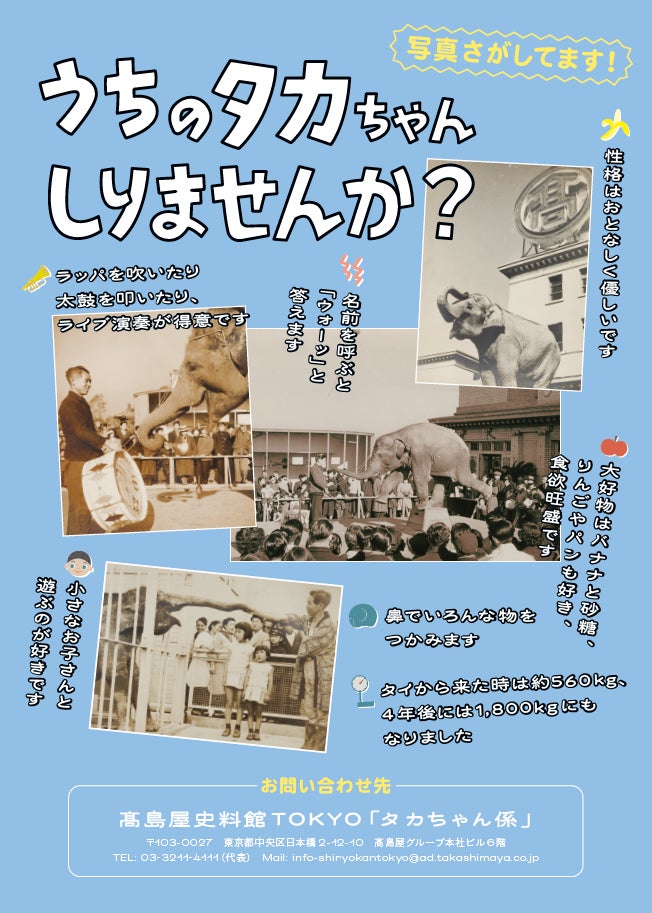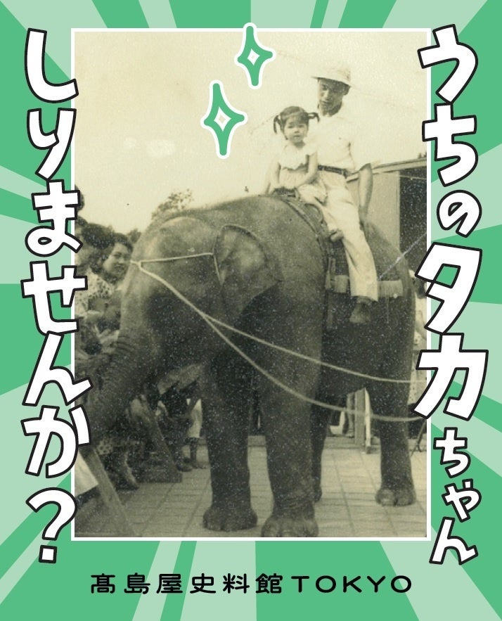 戦後間もない1950(昭和25)年5月〜1954(昭和29)年5月、日本橋高島屋の屋上には、タカちゃんという1頭のゾウがいて、日本橋高島屋は「ゾウのいる百貨店」として多くの人に親しまれました。芸達者で優しく穏やかなタカちゃんは、たくさんの子どもたちに愛された人気のゾウでした。2026年3~8月開催予定の企画展「ゾウに乗るーデパートの屋上に暮らしたタカちゃん(仮称)」では、ゾウのタカちゃんを案内役としながら、当時、なぜここまで日本でゾウが熱狂的に受け入れられたのか、日本におけるゾウのイメージの変遷を丁寧にたどりながら、ひもといてみたいと考えています。本企画展開催準備のために立ち上がった「うちのタカちゃん しりませんか?」プロジェクト、ご協力のほどよろしくお願い申し上げます。