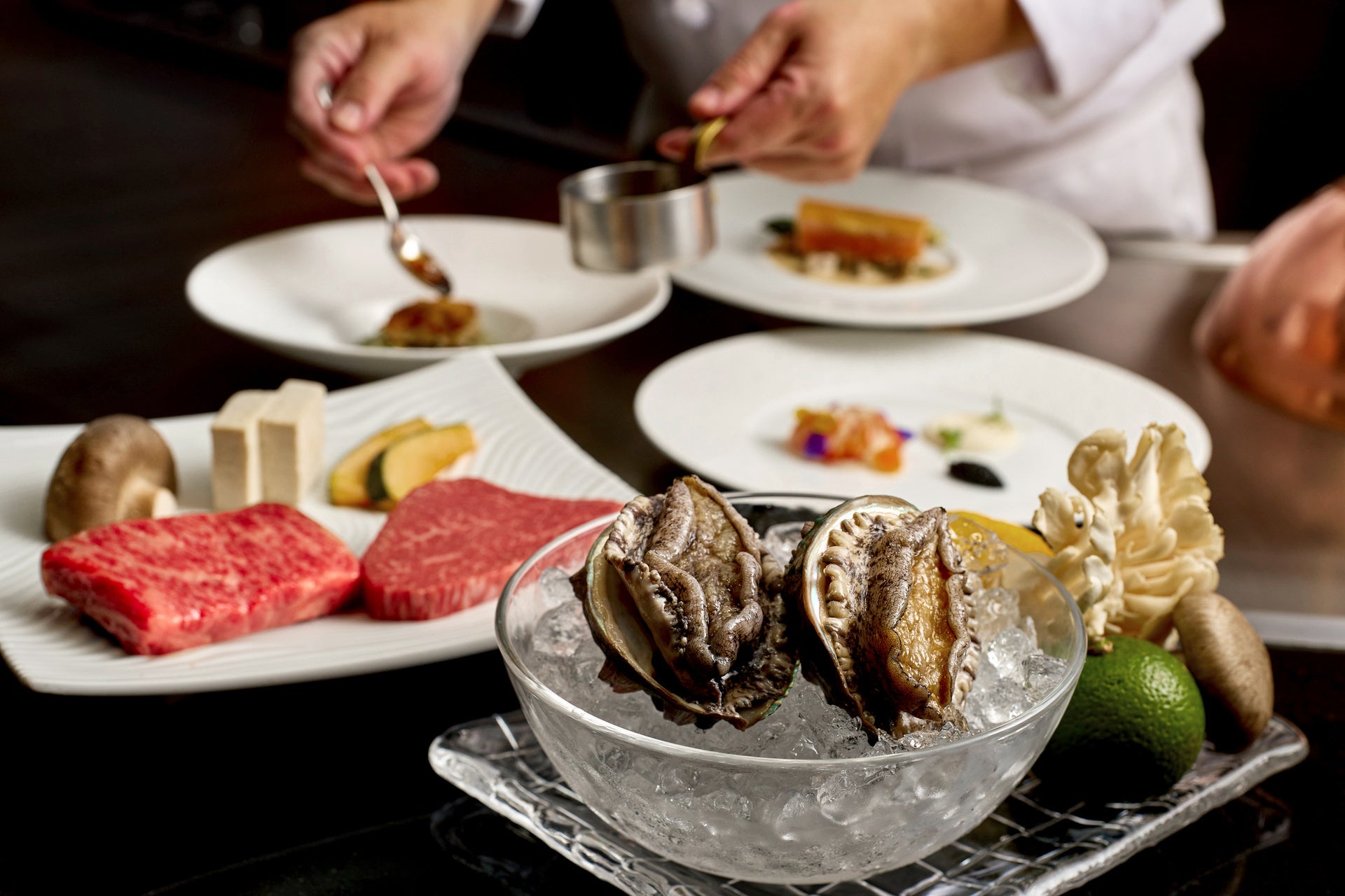 フレンチテイストの前菜は、1月は「オマール海老」、2月は「蟹」、3月は「鮑」と、月替わりでご用意します。メインをより引き立てる、品よく仕立てた前菜をお楽しみいただいたあとは、鮑(ディナーのみ)とステーキを目の前の鉄板で焼き上げます。シェフの技を臨場感とともにご堪能ください。