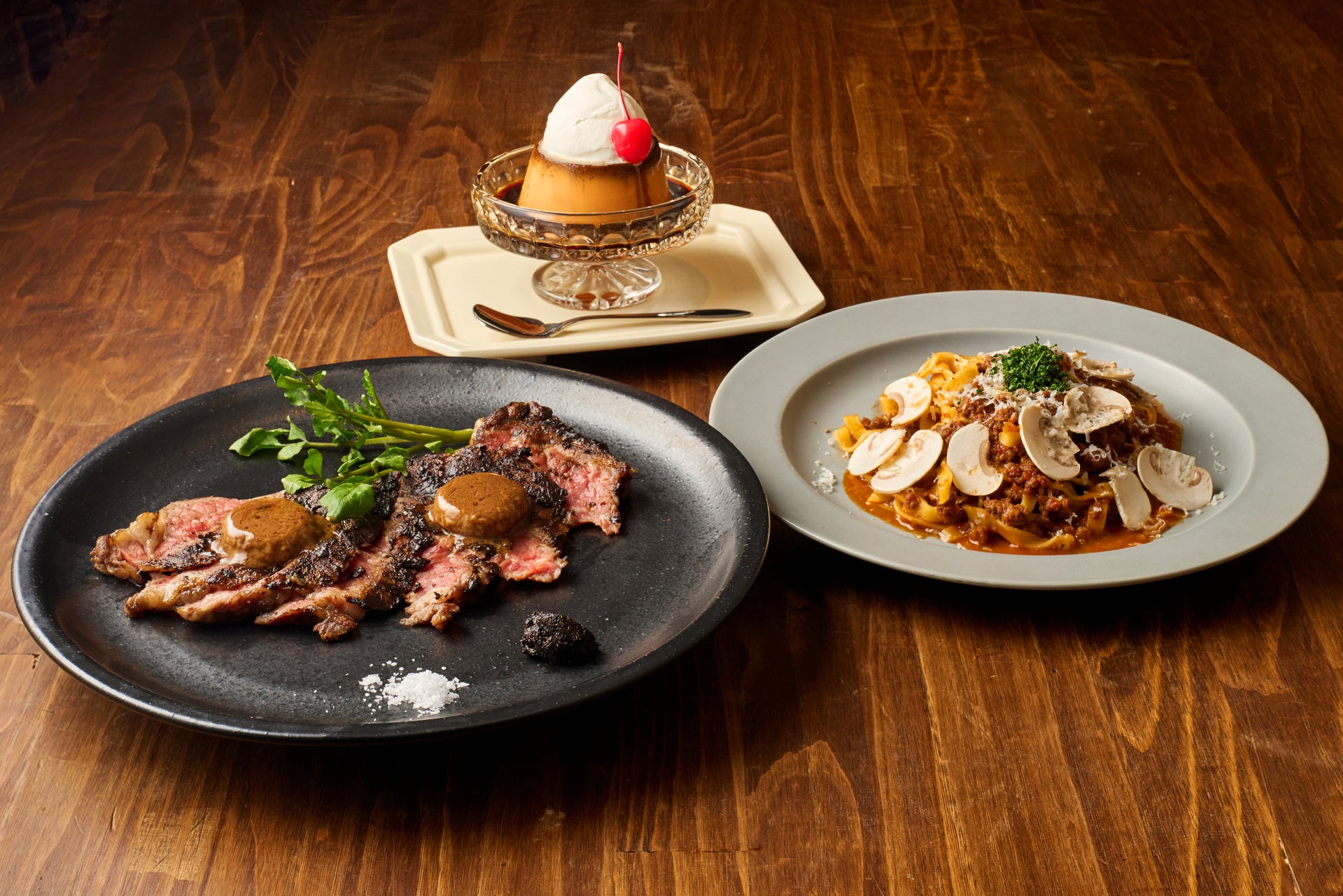 マッシュルームの芳醇な香りが広がる「熟成牛を使ったボロネーゼ タリアテッレ」、発酵バターとともに味わう「熟成牛のブラックガーリックステーキ」、濃厚で食べ応えのある「IGNITEの濃い味プリン」といった、満足感の高い多彩なメニューをご提供します。