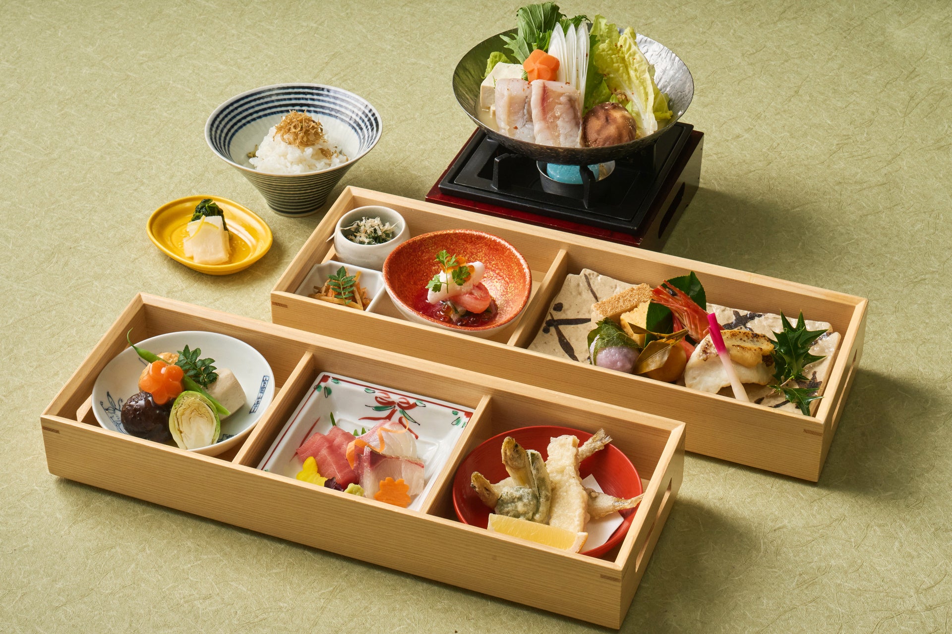 季節の天麩羅や鯛柚子味噌田楽など、季節のお料理を桐箱の二段重でお愉しみいただけるほか、鮟鱇の味噌鍋を一人前の小鍋でご用意します。
