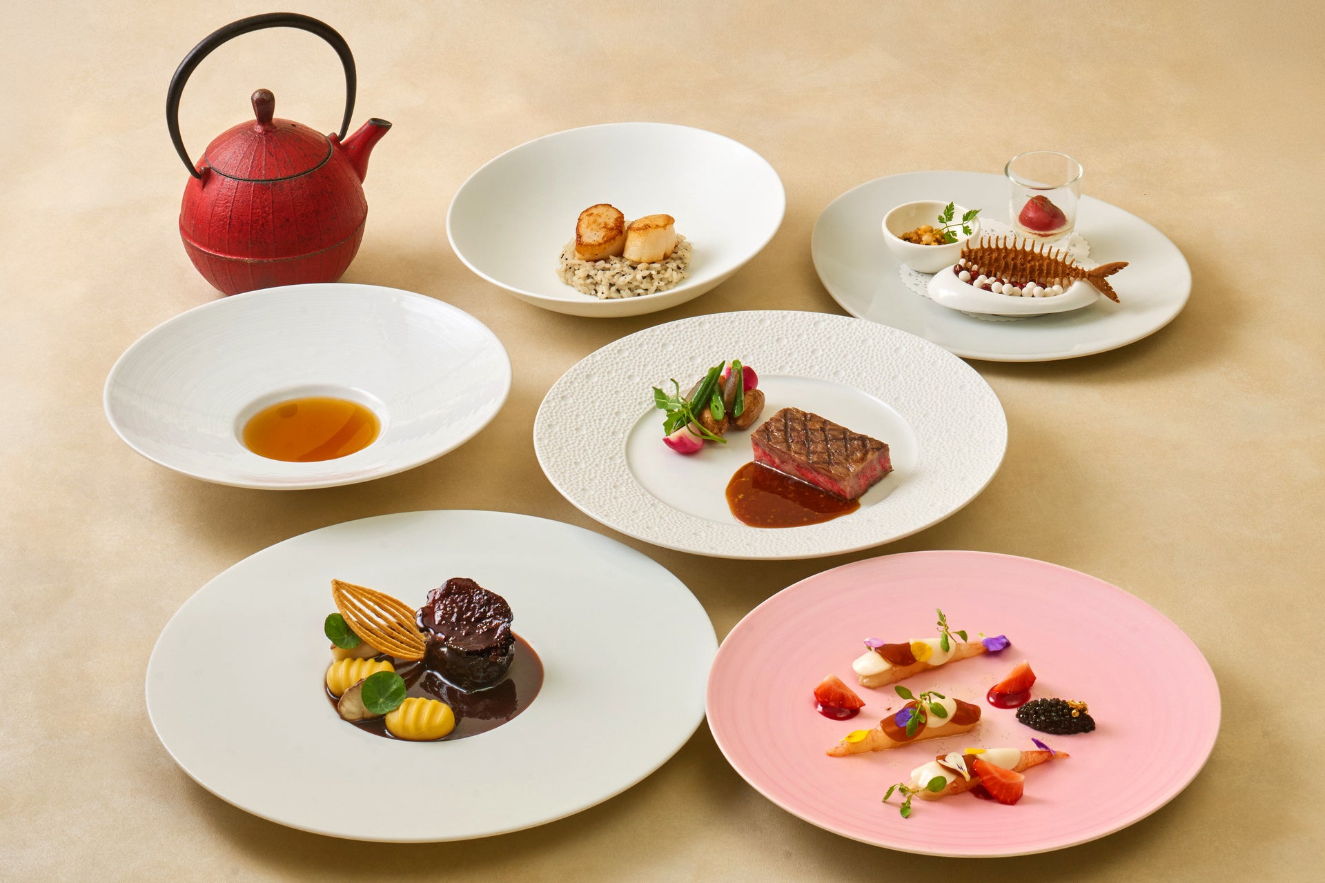 宮崎牛を使用した「山葵風味のジュ・ド・ヴィアンド」や「近江牛のブレゼ ポテトとパルメザンチーズのニョッキ」など二種類の銘柄牛を味わえるほか、いちごをあしらったボタン海老の前菜や、「ホタテ貝と黒トリュフのリゾット」などの海鮮も堪能できる贅沢なフレンチコースです。