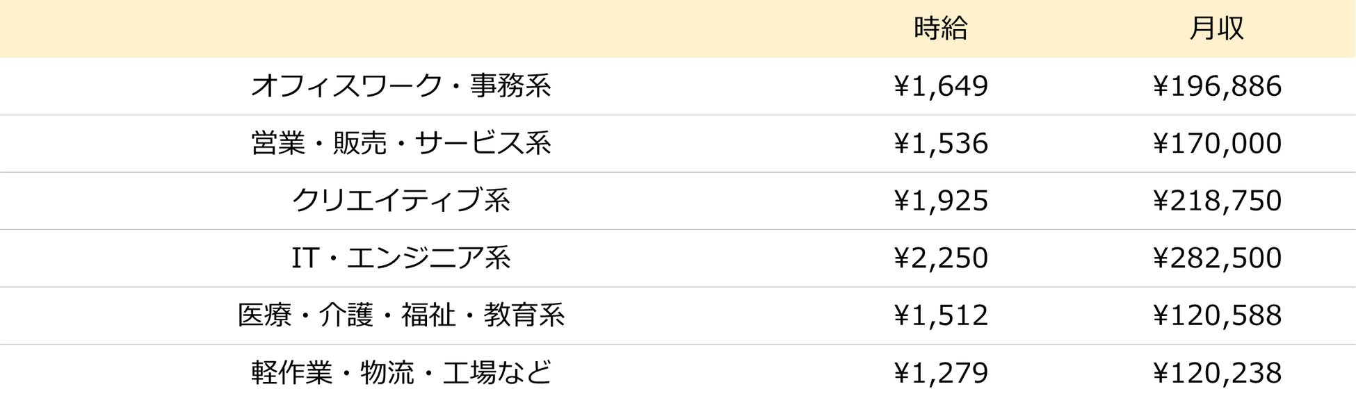 職種別の平均時給、最高額はIT・エンジニア系の「2,250円」でした。職種別の平均月収、最高額は同じくIT・エンジニア系の「282,500円」でした。