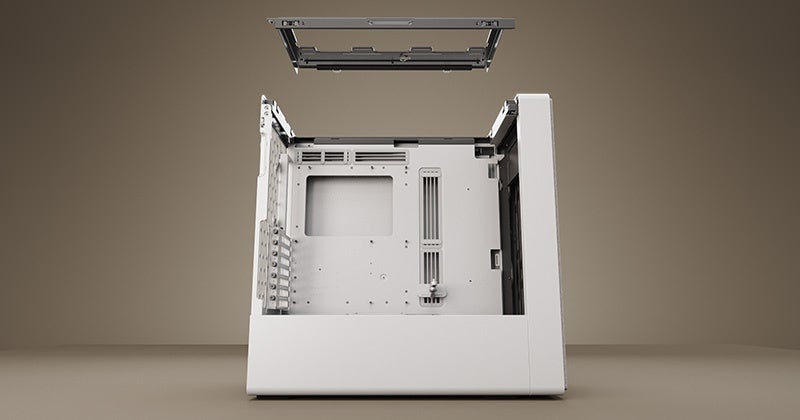 トップのファンブラケットはフレームと一体になっており、外すと広いスペースが生まれます。内部へ手を入れやすく、組み立て作業をしやすいデザインです。