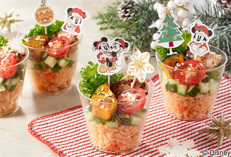 2025年12月4日(木)からは、Kit Oisix「<ミッキー&フレンズ>クリスマスサラダ」も登場。バルサミコ酢を使った大人も満足できる味わいで、ボリューム満点のチキンライスと香ばしいグリル野菜やチキンでつくるリースが目にも楽しいメニューです。食材とレシピ、キャラクターが描かれた小物などはすべてセットでお届け。レシピカードには、ご飯の盛り付けをお子さまでも失敗なく楽しめる<ミッキー>型ガイドや、カップで盛り付けるアレンジ紹介もあり、調理や盛り付けを家族で楽しめます。