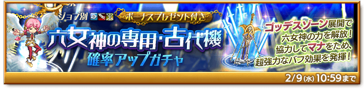 期間中、「ジョブ別 六女神の専用・古代機確率アップガチャ」を販売します。