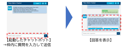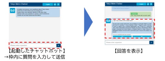 お客様が東京メトロの各言語のホームページに表示されるチャットボットに質問を入力すると自動的に回答が表示されるほか、チャットボットを経由してお忘れ物に関するお問合せも可能です。更に、「東京メトロチャットボット」は24時間/365日ご利用いただけます(メンテナンス時などを除く)。