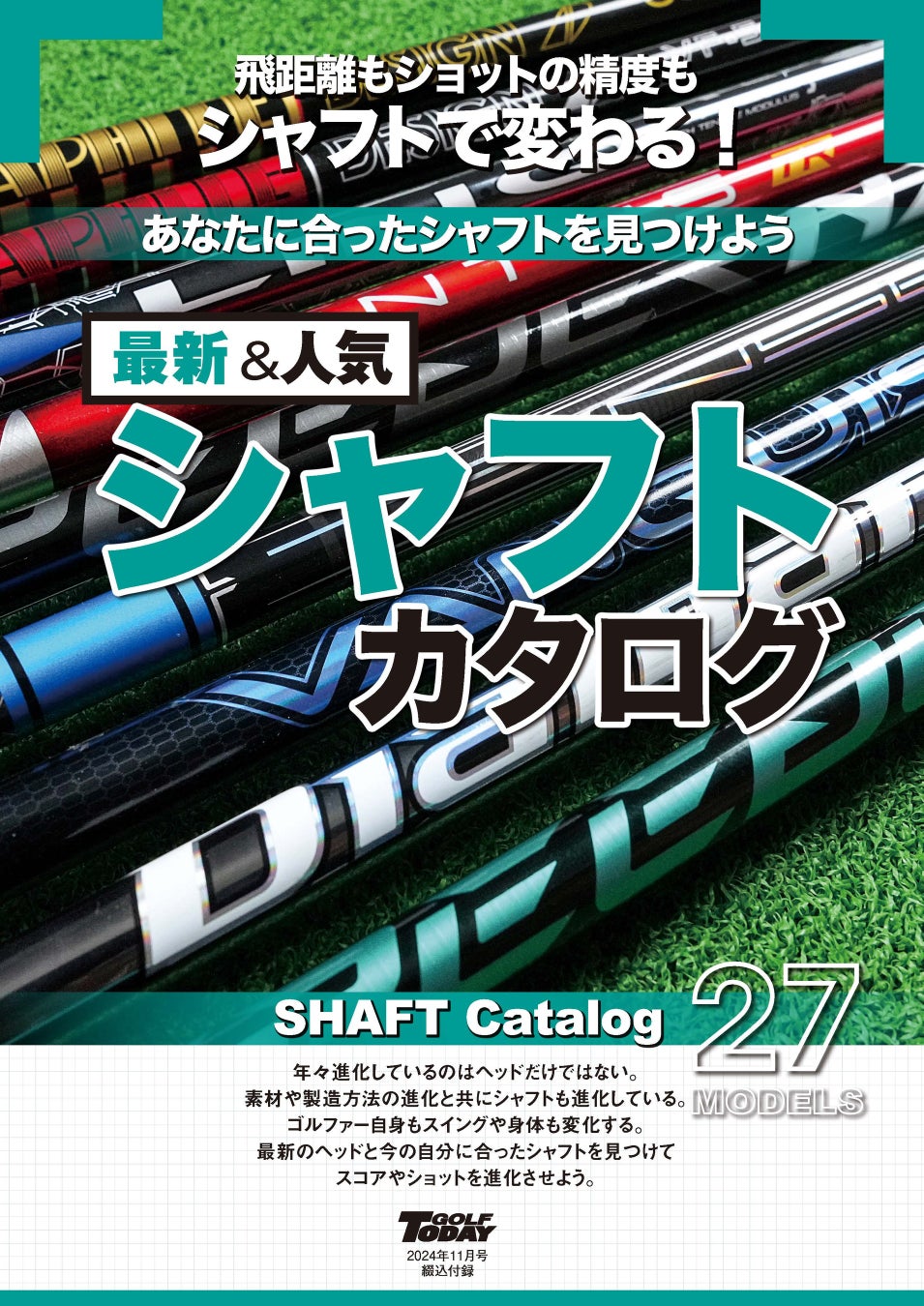 綴じ込み付録は「最新&人気シャフトカタログ」。最新のムック「シャフト選びの徹底ガイド&グリップ・カタログ」から厳選27モデルを収録して掲載。