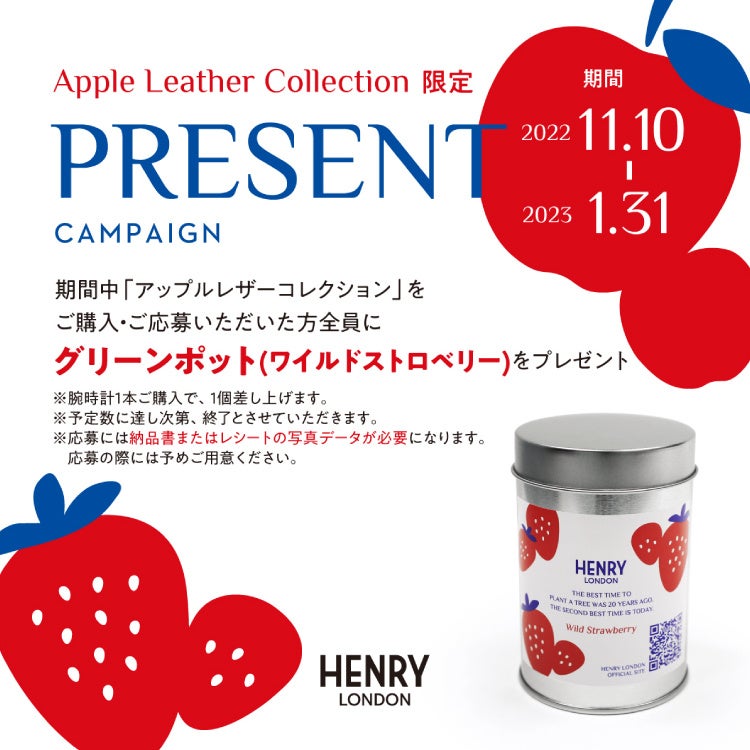 株式会社ウエニ貿易(本社:東京都台東区、代表取締役社長:宮上光喜)は日本総代理店を務める時計ブランド「HENRY LONDON(ヘンリーロンドン)」で、アップルレザーを採用したコレクション『アップルレザー コレクション』計10型を11月10日(木)に全国の百貨店・時計販売店・セレクトショップで発売します。また、公式オンラインストアでは11/7(月)から予約販売を開始ます。さらに、「グリーンポッド」をプレゼントするサスティナブルなキャンペーンを開催します。