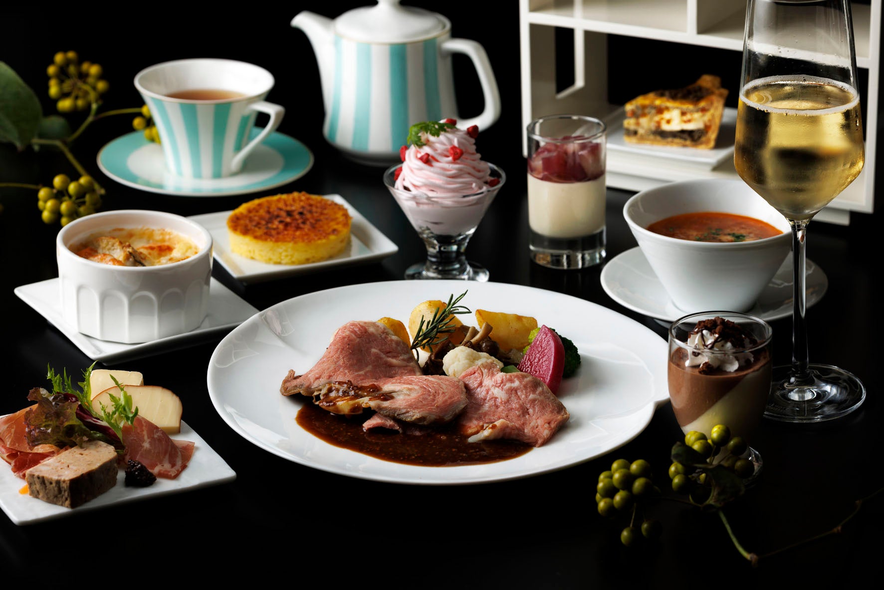 ティースタンドをホワイトツリーに見立てたクリスマス限定のスペシャルメニューをご用意。チョコレートムースや苺のティラミスなど4 種のスイーツと、トリュフが香るキッシュや鮑、海老、帆立貝のココットグラタンなど高級食材をつかったセイボリーにくわえ、メインには黒毛和牛サーロインのローストビーフがフェスティブシーズンの特別な夜をお約束します。