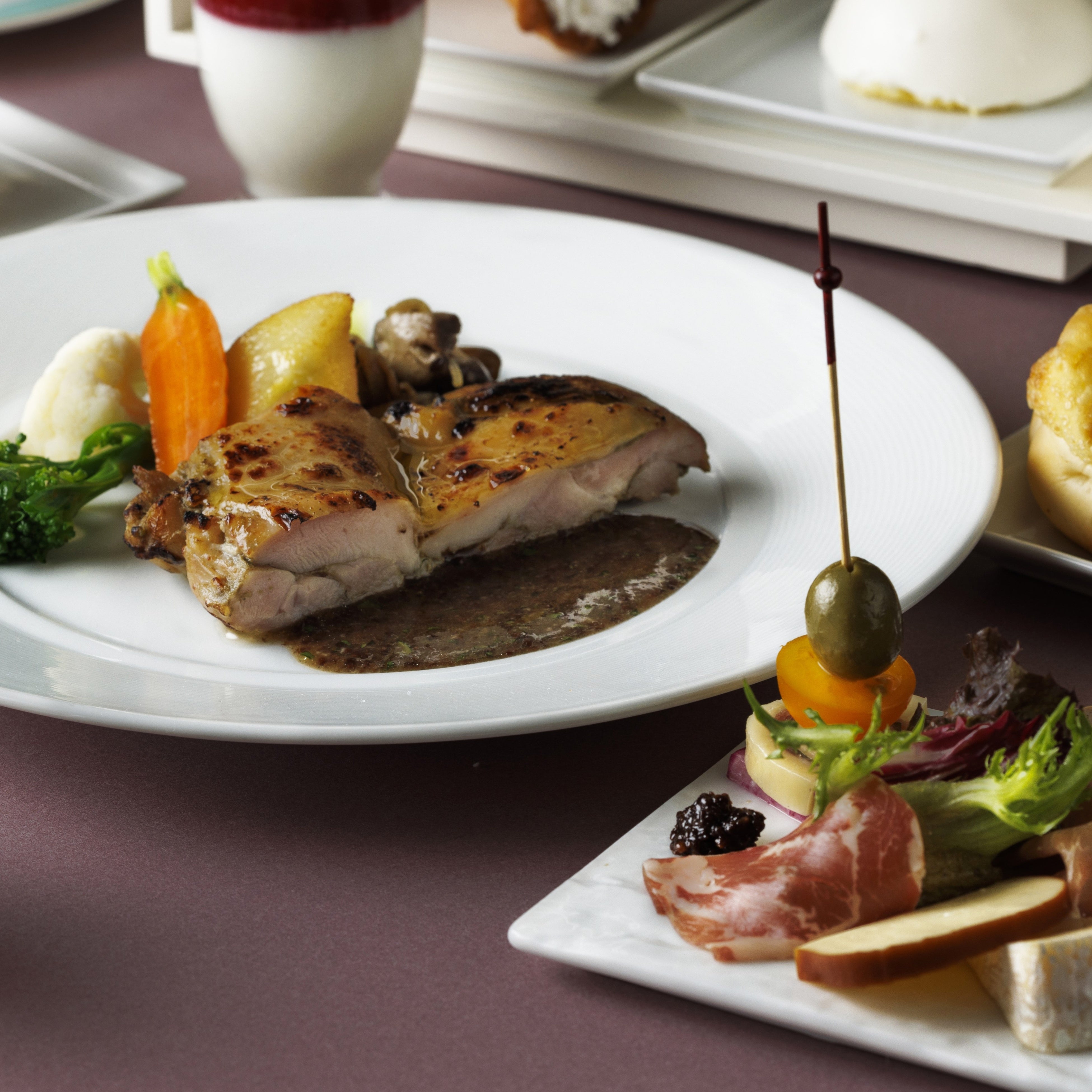 そして今回のスイーツはイタリアンづくし!サバランは、みかん味のジューシーな一品。サクサクと軽い食感が楽しいカンノーロはリコッタチーズがさっぱりしたテイストの、何個でも食べたいほどの美味しさ。メインの津軽どりもも肉を炙り焼きで焼き色をつけ、ハーブの風味で仕上げました。