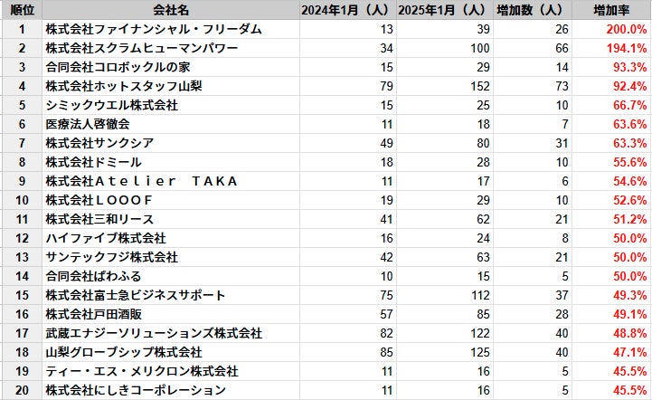 「誰もが活躍できる仕組みをつくる。」をミッションに掲げ、セールスチームの武器となるデータベース「SalesNow」を展開する株式会社SalesNow(本社:東京都渋谷区、代表取締役:村岡功規、以下「SalesNow」)は、国内550万社の企業情報を完全網羅した日本最大級のデータベース「SalesNow DB」より、山梨県に本社を置く企業の2024年1月時点および2025年1月時点の従業員数データを分析し、従業員数増加率ランキングTOP20を発表しました。本ランキングは、各企業の成長スピードを可視化するものであり、新規雇用の創出や事業拡大の動向を明らかにしています。