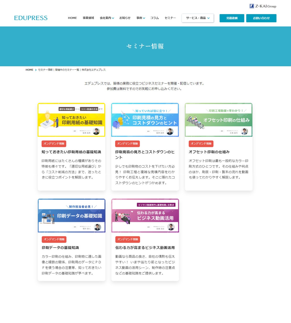 エデュプレスは「無料のセミナー」シリーズを多数実施し、好評を博しています。なかでも、印刷関連のセミナーは30年以上前から毎月開催していましたが、新型コロナウイルス感染拡大により動画セミナーに切り替え、日時を限定して配信していました。