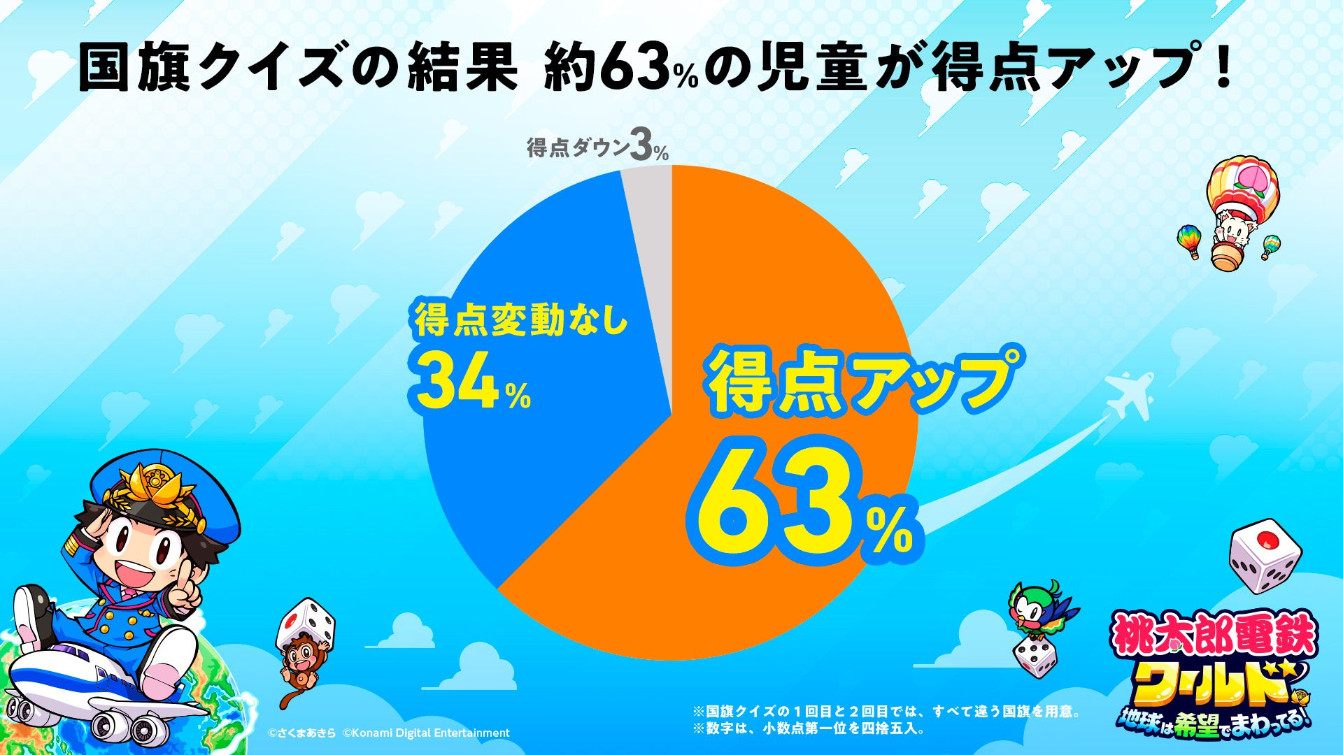 ・ゲームプレー前後に実施した「国旗クイズ」(各10問ずつ)では、33人中20人(63%)が得点アップ。