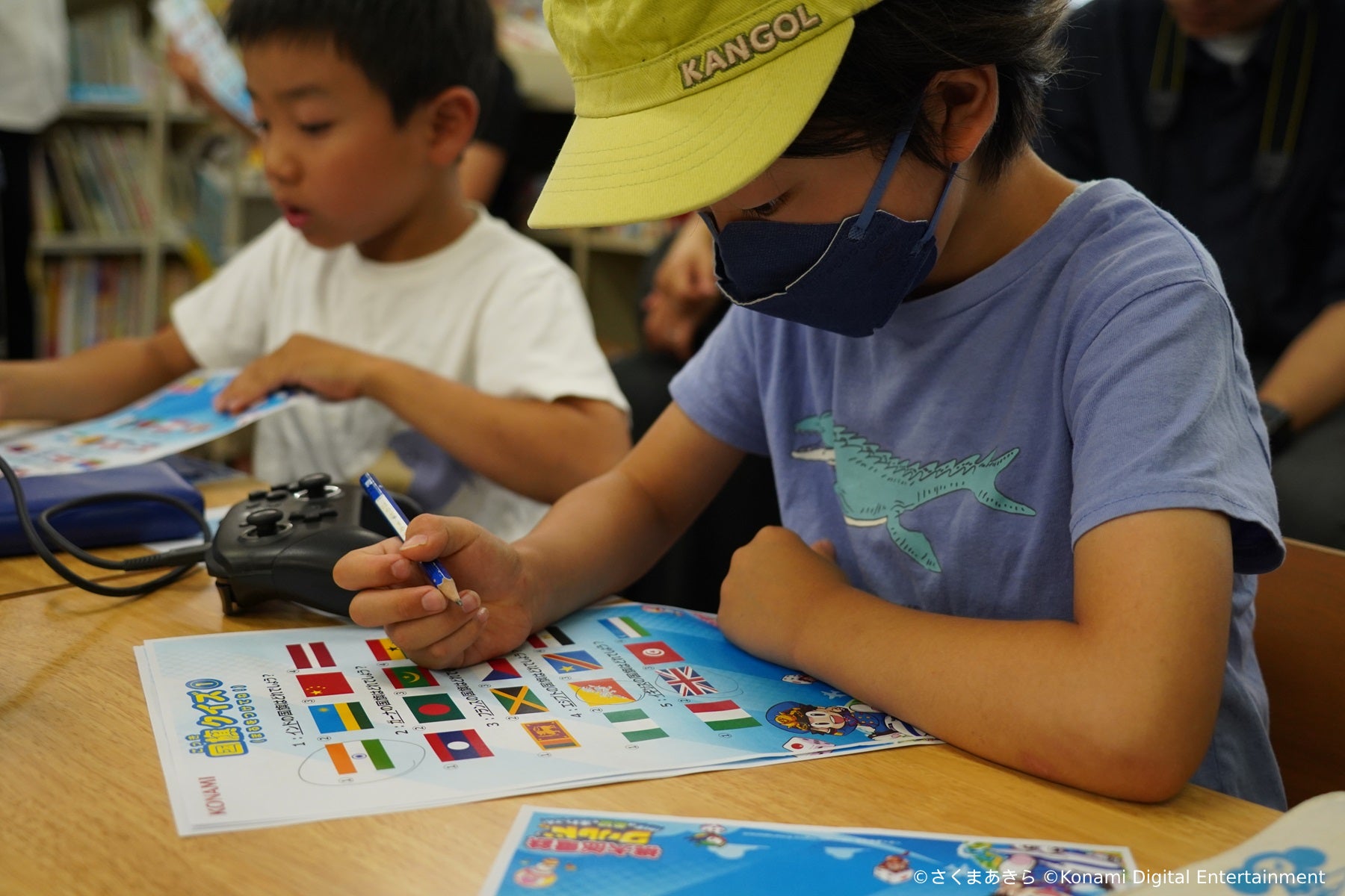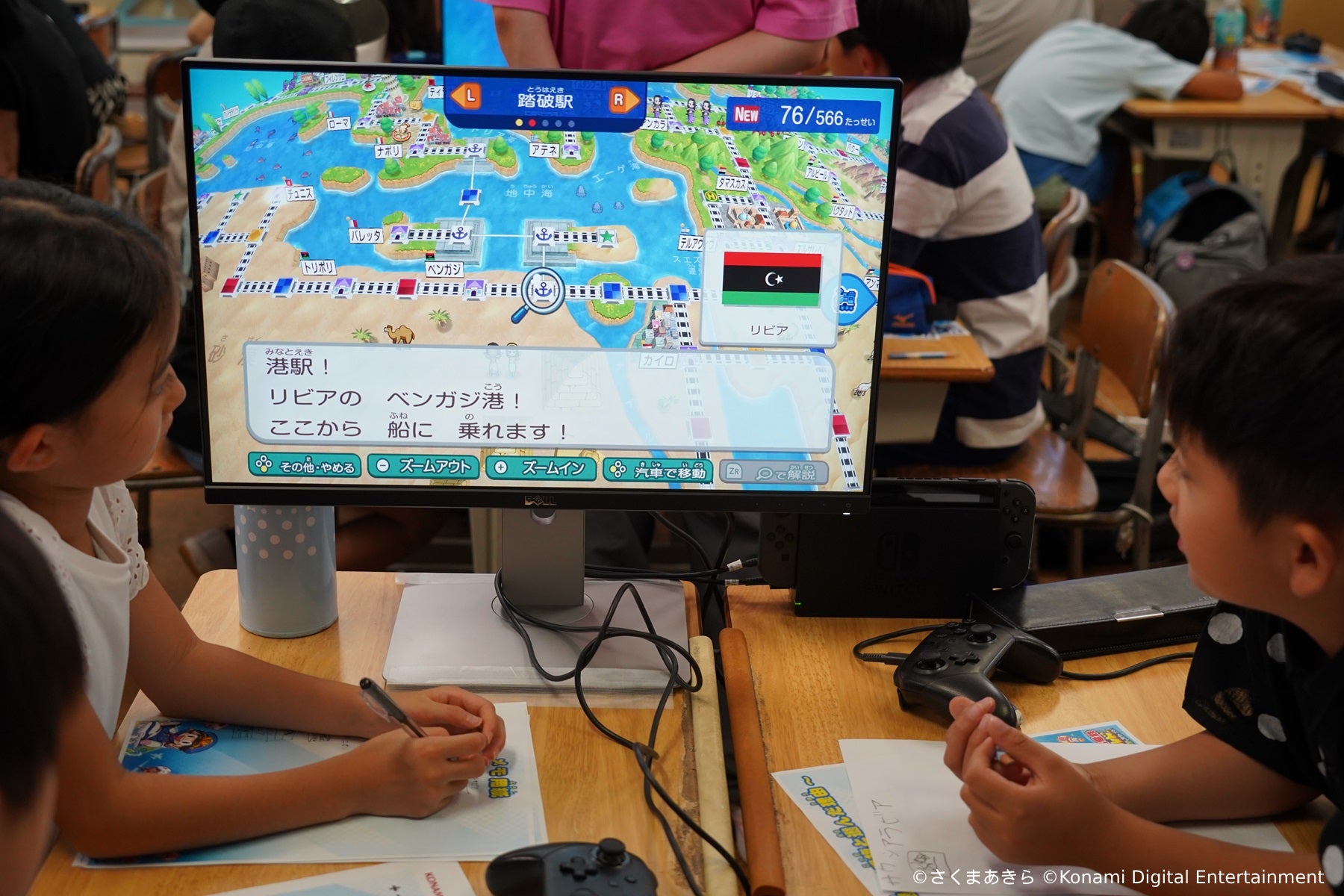 2024年7月、都内の小学校(東京学芸大学附属小金井小学校)にて、「ゲームで国旗を学ぼう!」をテーマとした『桃鉄ワールド』体験イベントを実施しました。イベントには33人の児童が参加し、『桃鉄ワールド』(1年設定)をプレーしたほか、ゲームプレーの前後に2回「国旗クイズ」(各10問ずつ)に回答するなどの課外活動を行いました。