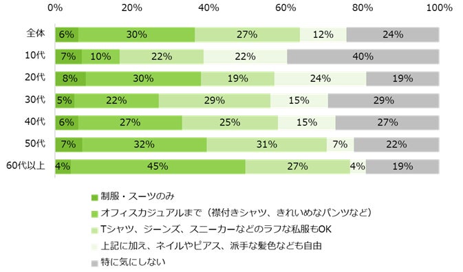 職場の“服装・身だしなみ”について許容できる範囲を質問すると、ボリュームゾーンは「オフィスカジュアルまで(襟付きシャツ、きれいめなパンツなど)」(30%)でした。年代別で見ると、10代は「特に気にしない」(40%)が、30代は「Tシャツ、ジーンズ、スニーカーなどのラフな私服もOK」(29%)がそれぞれ最多でした。
