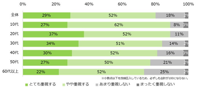 「仕事を選ぶ際、職場のルール(服装、髪型、働き方など)の自由度をどの程度重視しますか?」と伺うと、81%が「重視する」と回答しました(とても重視する:29%、やや重視する:52%)。年代別で見ると、10代・20代が最も多く(10代:89%、20代:89%)、60代以上(74%)と15ポイントの乖離があり、若い年代ほど柔軟に働ける職場環境を求める傾向にあることがうかがえます。