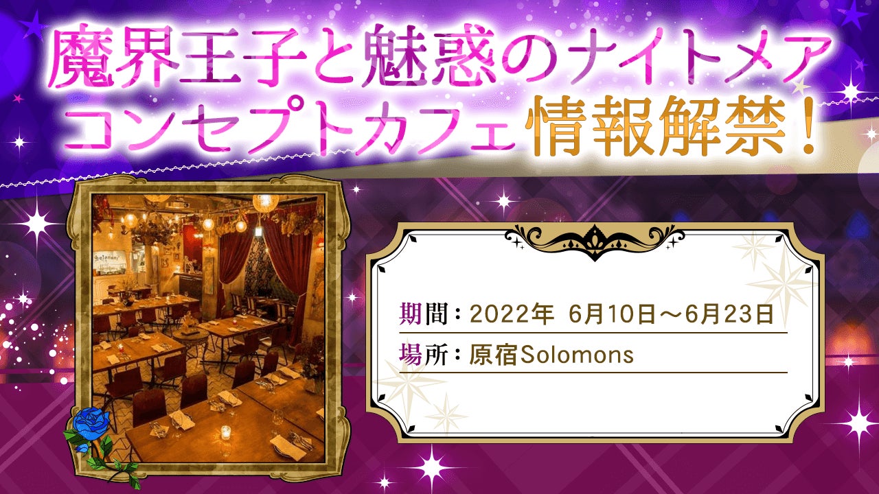 本コンセプトカフェは「魔界ナイトメア」が今年2月に配信4周年を迎えたことを記念した企画です。「魔界ナイトメア」史上初となるコンセプトカフェは作品の雰囲気に合った内装の東京・原宿Solomonsにて開催いたします。